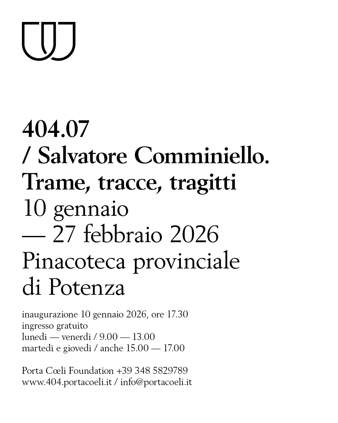 Si inaugura sabato 10 gennaio 2026, alle ore 17.30, Trame, tracce, tragitti, la nuova mostra personale di Salvatore Comminiello che costituisce la settima tappa di 404, il Programma per l’arte contemporanea di Porta Cœli Foundation a cura di Donato Faruolo. La mostra sarà visitabile fino al 27 febbraio presso la Pinacoteca provinciale di Potenza, e gode del patrocinio della Provincia di Potenza e del Consiglio regionale della Basilicata.