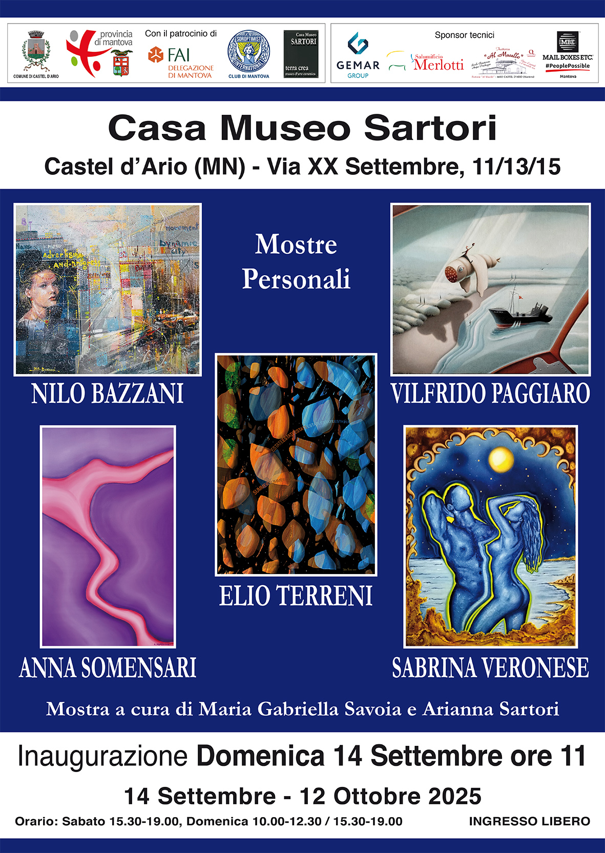 La Casa Museo Sartori di Castel d’Ario (MN), in via XX Settembre 11/13/15, ha organizzato le mostre personali degli artisti Nilo Bazzani, Vilfrido Paggiaro, Anna Somensari, Elio Terreni, Sabrina Veronese, contestualmente alla mostra “Vedutismo inciso 100 acqueforti di Guido Resmi e Pericle Menin”, che saranno aperte al pubblico da domenica 14 Settembre a domenica 12 Ottobre 2025.