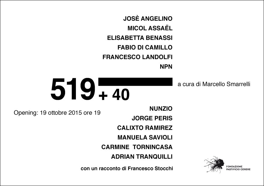 Lunedì 19 ottobre 2015 alle ore 19 inaugura la mostra collettiva 519 + 40 - ideata da Nunzio, a cura di Marcello Smarrelli - realizzata nell’ambito delle iniziative volte a celebrare i 10 anni di attività della Fondazione Pastificio Cerere e i 110 anni dalla costruzione dell’edificio dove ha sede. La mostra sarà aperta al pubblico dal 20 ottobre 2015 al 7 gennaio 2016.