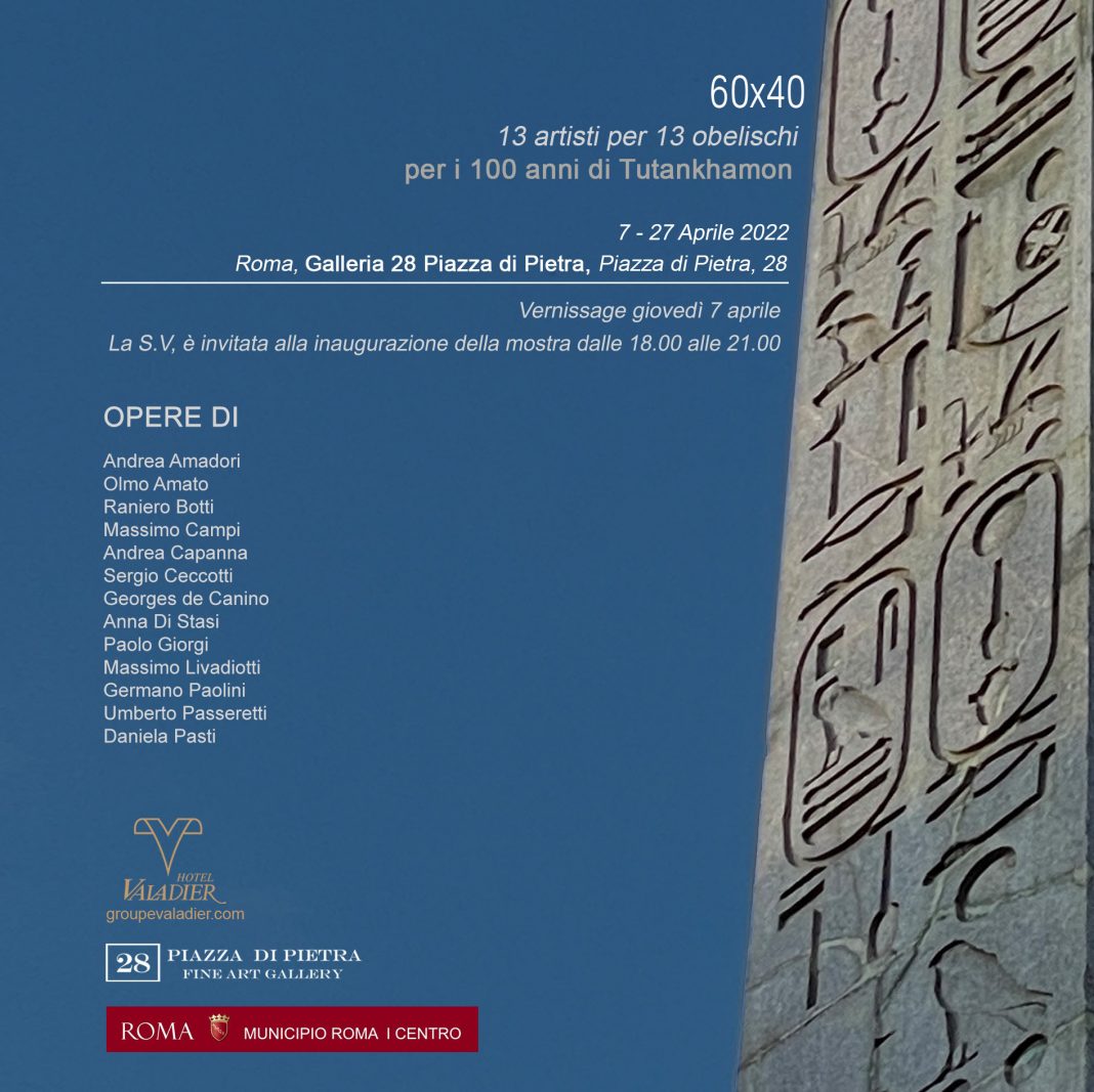 Una collettiva per celebrare i cento anni dalla scoperta della tomba di Tutankhamon e il singolare record della città di Roma, unica al mondo a vantare ben tredici obelischi. Undici pittori e due fotografi in un unico formato (60×40) ne restituiscono la loro personale visione.
