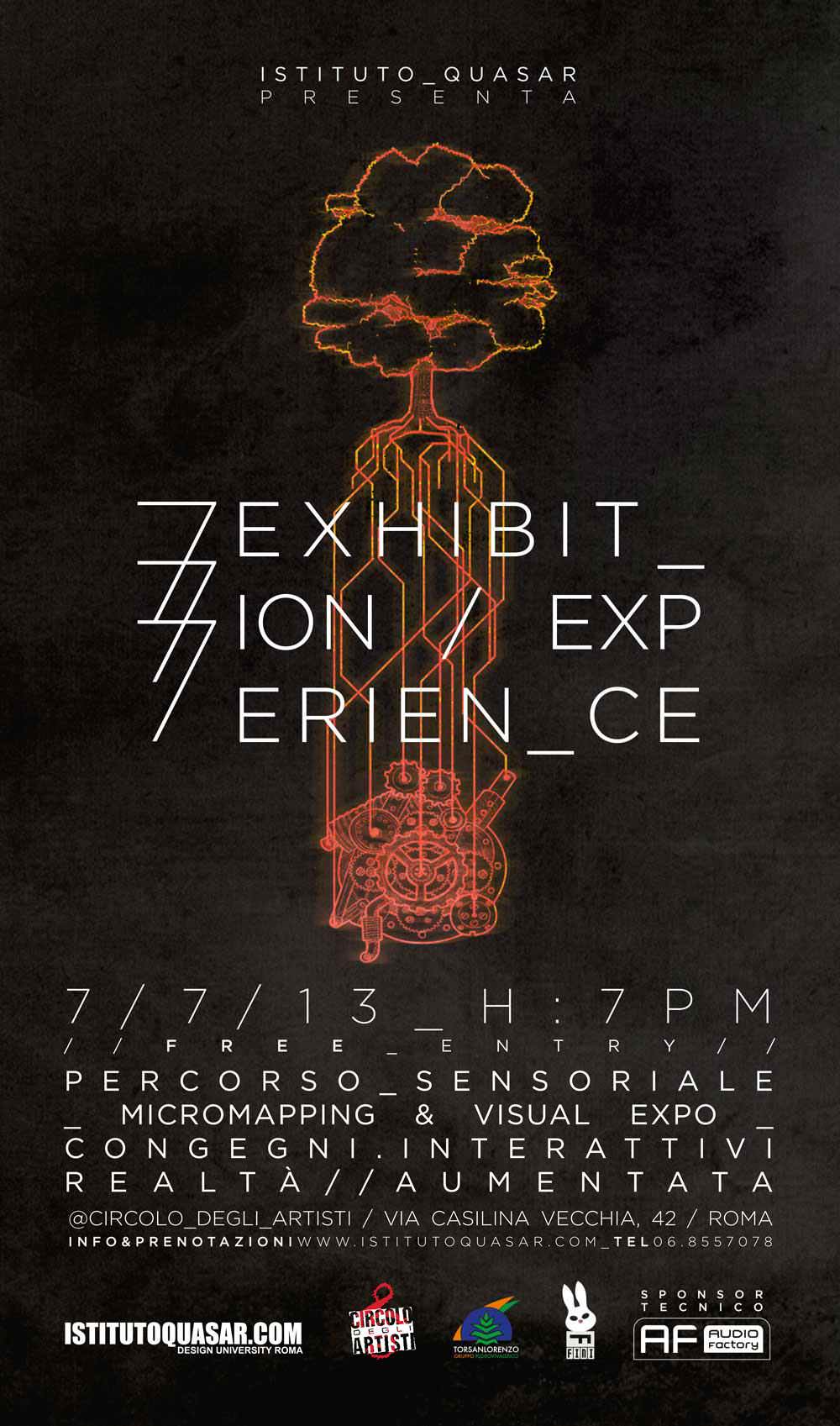 Il 7.7.7. Exhibition Experience - da sempre evento che celebra e porta al pubblico le eccellenze prodotte durante l’anno accademico dell’Istituto Quasar - proporrà per l’occasione un visual expo dei migliori lavori degli studenti, attraverso l’utilizzo delle più nuove tecnologie, quali la realtà aumentata ed il micro mapping. I progetti esposti abbracciano le varie discipline d’interesse della scuola: design, architettura d’interni, grafica e comunicazione visiva, interaction design, architettura del verde.