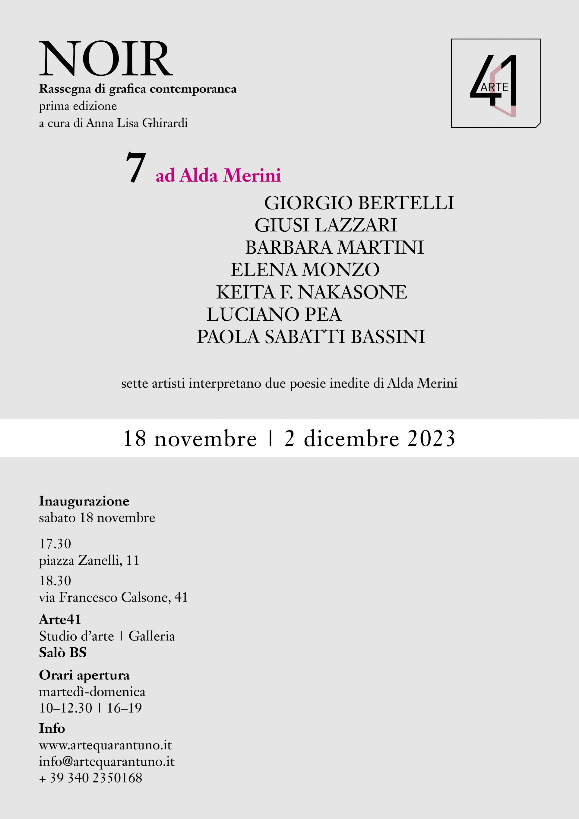 Una mostra, in due sedi, presenta l’opera dei sette artisti partecipanti alla prima edizione di NOIR. Prima Rassegna di grafica contemporanea e le loro incisioni dedicate a due poesie inedite di Alda Merini.