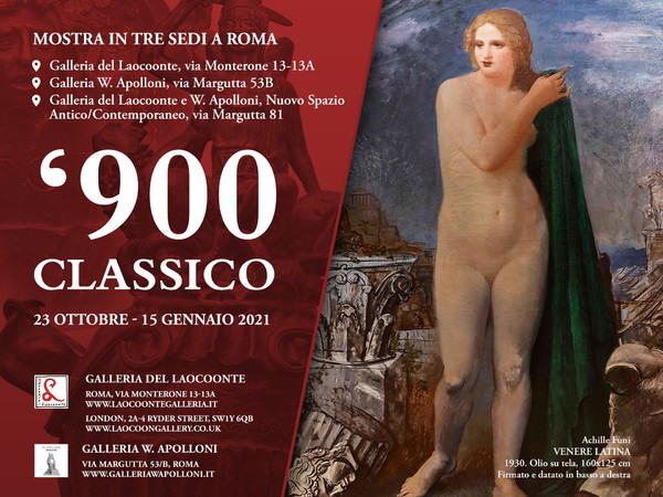 Come furono influenzati gli artisti italiani da tutto questo e quale corso ciò ha imposto allo sviluppo dell’arte italiana del Novecento è quello che si propone di evidenziare la mostra 900 CLASSICO, concepita e organizzata da Marco Fabio Apolloni e Monica Cardarelli, in ben tre sedi: nella Galleria del Laocoonte di Via Monterone 13-13A, nella Galleria W. Apolloni di Via Margutta 53B ed infine nel nuovo spazio espositivo contemporaneo che le unisce di Via Margutta 81, che si inaugurerà ospitando nel contempo la mostra antologica dello scultore contemporaneo Patrick Alò: MITOLOGIA MECCANICA, nelle cui opere i rifiuti della modernità tecnologica, i rottami di metallo, rinascono a nuova vita come opere di scultura neoclassica, tratte o ispirate dall’antico.