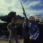 Passiamo così ai teatri di guerra che Cito ha documentato in prima linea per vari decenni (rischiando spesso la vita): dall’Afghanistan (1980) con i ritratti di guerriglieri, alla guerra del Libano, qui raccontata con alcuni scatti (1982/1983) a colori che ritraggono bambini che giocano con mitragliatori, Hezbollah armati, la distruzione a Beirut ovest dopo un attentato e un Arafat poco più che cinquantenne abbracciato da una donna in lacrime. Si passa quindi a uno dei temi che Francesco ha seguito, nel tempo, con particolare dedizione e trasporto, il conflitto e la questione palestinese, presente con tre scatti (1986, 1988 e 2002), e poi ancora a un soldato irakeno morto sulla strada per Bassora e i pozzi petroliferi in fiamme nella guerra del Golfo del 1991. A chiudere idealmente la sezione in un gioco di rimandi, una foto dell’Afghanistan (del 1989 ma tristemente attuale) in cui un Mullah mostra il Corano circondato da guerriglieri armati, un’immagine di Peshawar del 2008 con alcuni giovani intenti nello studio del Corano in una Madrassa, e una di Serra San Bruno in Calabria (1989) con un gruppo di frati certosini inginocchiati in preghiera.