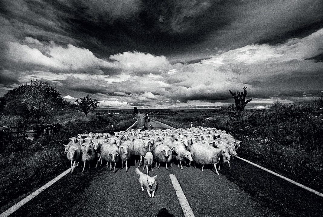 Così, al termine di questo percorso, si arriva in Sardegna (1989/2003). Sono immagini di un’Isola raccontata all’interno, lontano dalla costa, un’isola di modi e riti arcaici, in cui il cavallo è ancora una presenza importante e in cui a carnevale, nonostante rari angioletti chiari, il colore dominante è il nero. Una serie di immagini di momenti rituali, sempre in bilico tra sacro e profano, e di situazioni stranianti: una donna che imbraccia un fucile a pompa per festeggiare S’incontru, le maschere di carnevale che rimandano alle bestie della vita quotidiana, i pesanti campanacci appesi alla schiena di un Mamuthone a riposo, i funerali di fantocci. Invece ridono tre anziane ollollaesi alla finestra, durante la follia dell arcaico carnevale, e ridono anche gli Intintos di Olzai e un uomo di Orgosolo con soli tre denti così simile al murale alle sue spalle. Vola un chierichetto mentre suona le campane per S’Ardia al santuario di Santu Antinu, e poco dopo riparte la sfrenata “giostra” equestre. Poi tutto a un tratto tutto si ferma e si fa di nuovo austero, come la coppia a San Francesco di Lula, col Supramonte alle spalle, che guarda lontano, lontano ma non troppo (come tutto in Sardegna), o il pastore che conduce il suo gregge, sotto un cielo carico, in una piana che sembra amplissima: sintesi dell’ampio sguardo di un grandissimo fotoreporter.