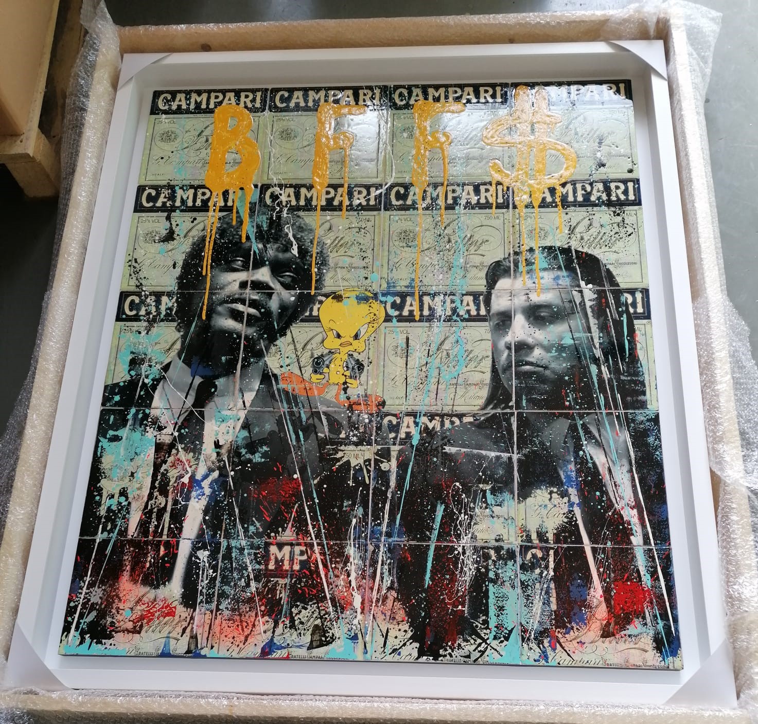 Si prosegue con “Best Friends Forever” di Skiri, l’artista gioca con le icone del film di Tarantino stravolgendone l’indole e trasformando Samuel L. Jackson e John Travolta in due moderni angeli custodi che si ergono a difesa dell’iconico cartoon Titti, che abbandona i panni del fragile e dolce canarino per trasformarsi in uno spietato criminale, ritratto con tanto di pistole.