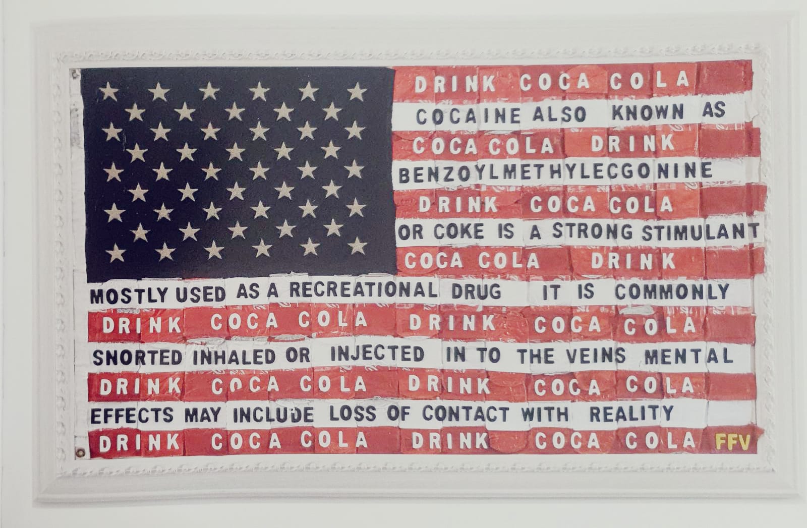 Si prosegue con Fabio Ferrone Viola e la sua “Cocaine USA Flag”; la bandiera è realizzata in lattine di Coca Cola pressate ed inserite nella trama del tessuto. L’opera nasce dalla ricerca che l’artista da sempre fa sui simboli americani e le loro origini. Le strisce bianche, sono il nesso tra la scritta della bevanda allo stupefacente e il consumo spropositato che se ne fa, in modo particolare negli States.