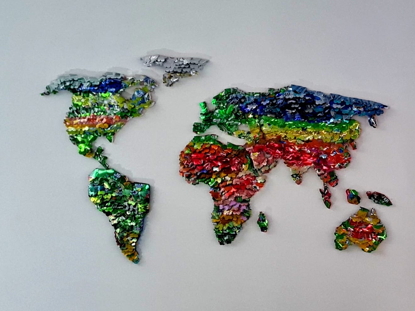 E’ un’arte che racconta l’importanza del riciclo e del rispetto ambientale quella di Biagio Castilletti, il cui “World”, installazione di circa 2400 parti di lattine montate su pannello in pvc, conquista e affascina lo spettatore. I vari frammenti sono stati trattati con resine che ne esaltano le differenti sfumature di colore con la finalità di evidenziare le diverse aree geografiche e climatiche, le tonalità verdi sono usate per le foreste dell’Amazzonia e le aree tropicali, le sfumature in rosso per le aree Equatoriali ed i toni freddi per quelle Polari.