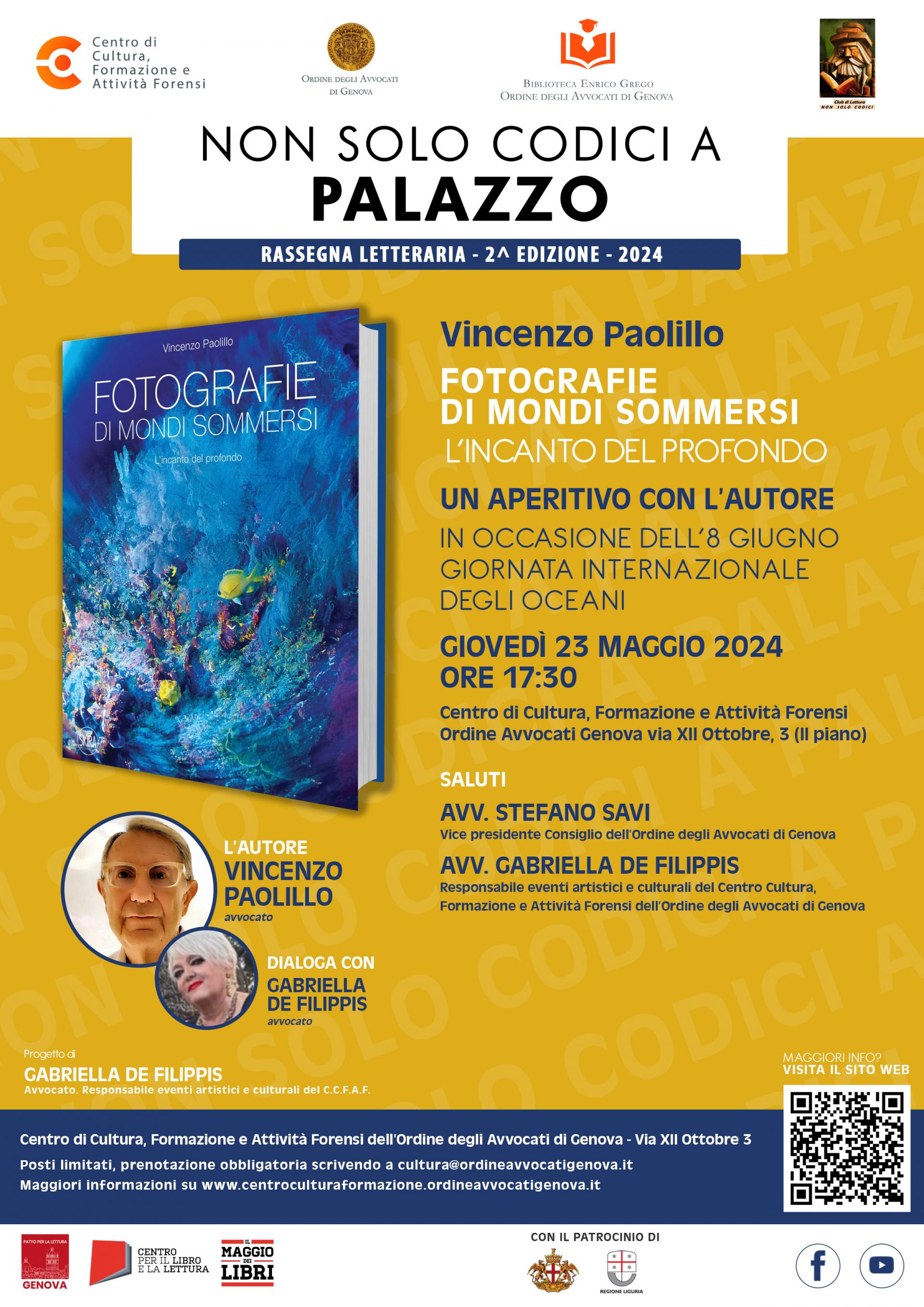 In occasione dell’8 giugno, giornata internazionale degli oceani, giovedì 23 maggio 2024, alle ore 17,30, nei locali del Centro Cultura Formazione e Attività Forensi, in via XII ottobre 3, nell’ambito della rassegna letteraria UN APERITIVO CON L’AUTORE sarà presentato il libro di Vincenzo Paolillo dal titolo FOTOGRAFIE DI MONDI SOMMERSI – L’INCANTO DEL PROFONDO e a dialogare con lui questa volta sarà la ideatrice del progetto, l’avv. Gabriella de Filippis.