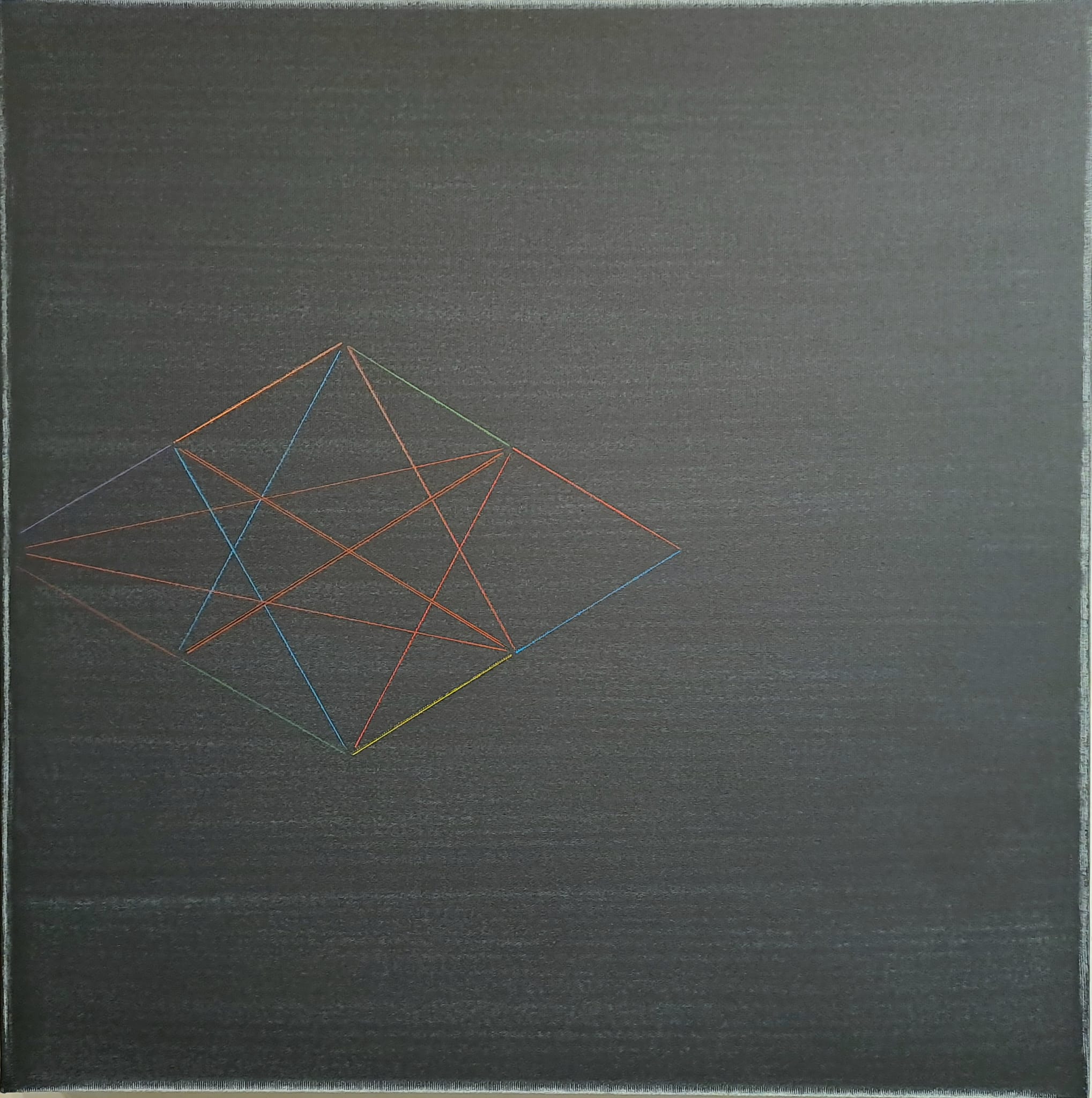 I lavori – carte, tele e una scultura in metallo – sono suddivisi in 6 nuclei entro una progressiva elaborazione delle proporzioni auree, dalla linea al poligono plastico regolare, raffinata e sottile stilizzazione del cristallo: Visione, Segnale aureo, Luogo, Frammenti, Luogo-Spazio, Aureo.
