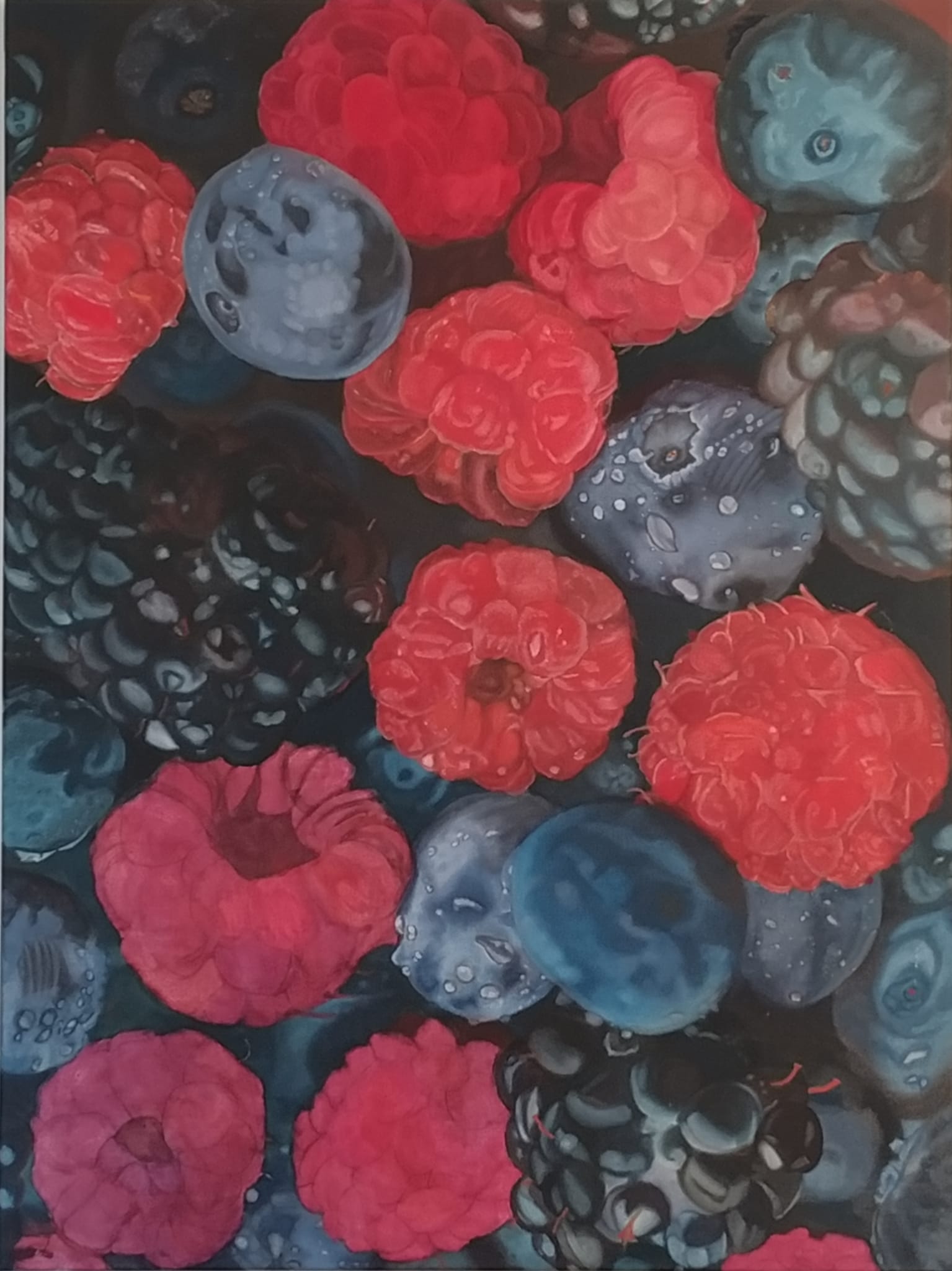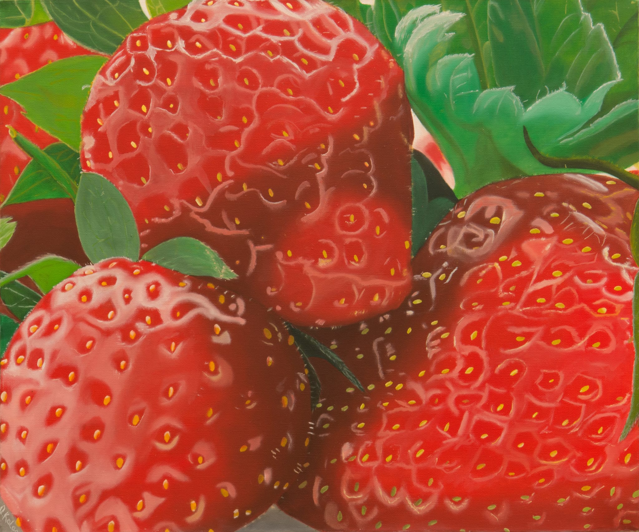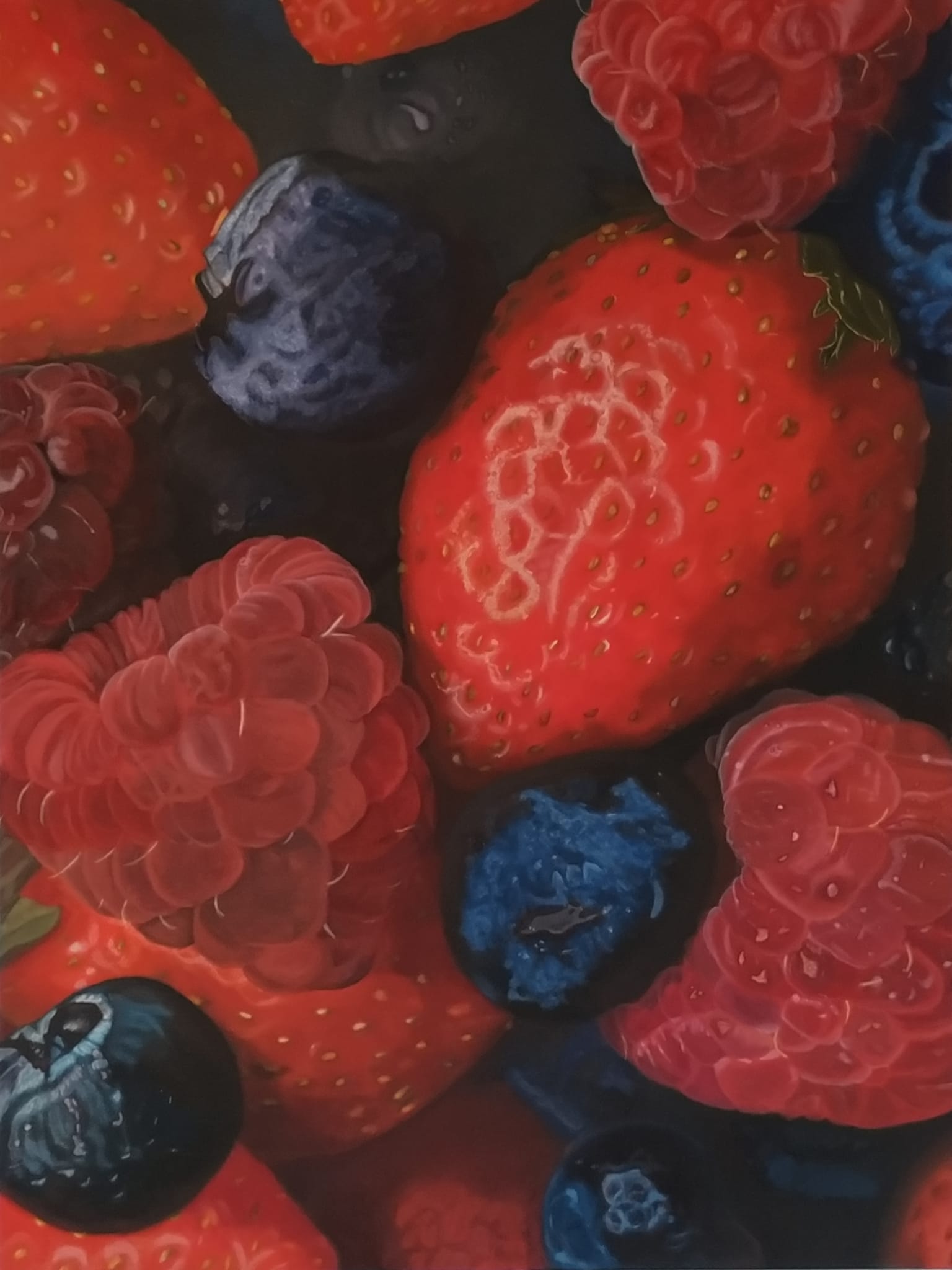 Pomodori e frutti di bosco giganti, sono dipinti ad olio su tela con una tecnica straordinaria che porta lo sguardo a penetrare ogni più piccolo particolare delle opere di Oksana Kolosyuk, in un coinvolgimento che implica tutti i sensi, e che trascina il fruitore in una sorta di piacere estatico per cui la complicazione sarà distaccare lo sguardo dalla tela.