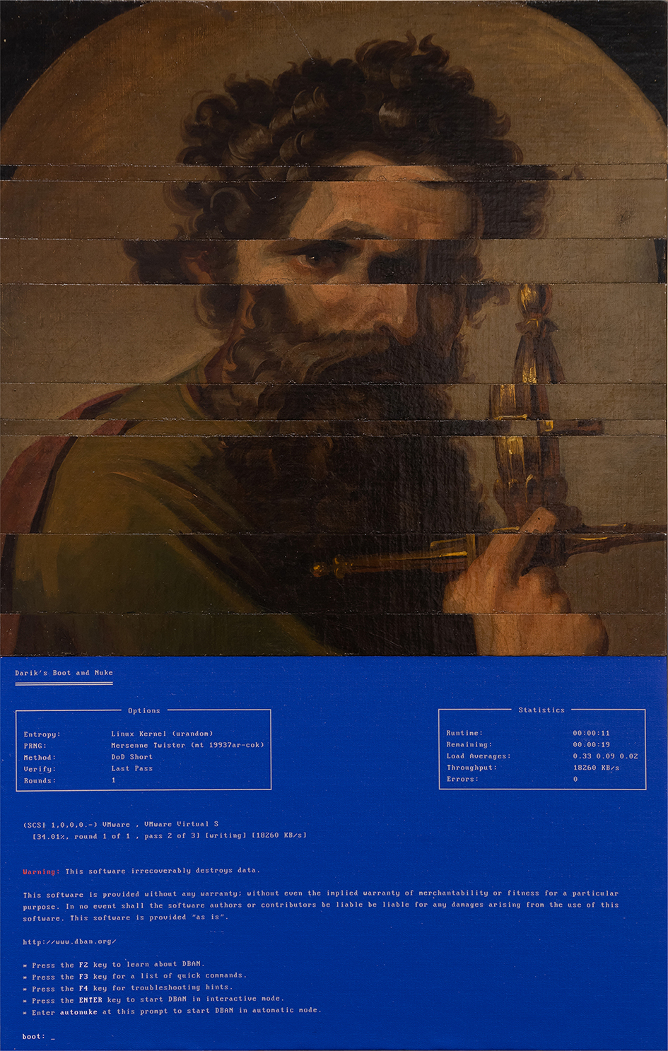 Nicolò Tomaini utilizza immagini storiche per riconfigurarle all’interno di tecnologie immaginate: codici informatici e linguaggi digitali reinventati riscrivono il passato come se la contemporaneità tentasse di archiviarlo e restituirlo attraverso nuovi sistemi di memoria.