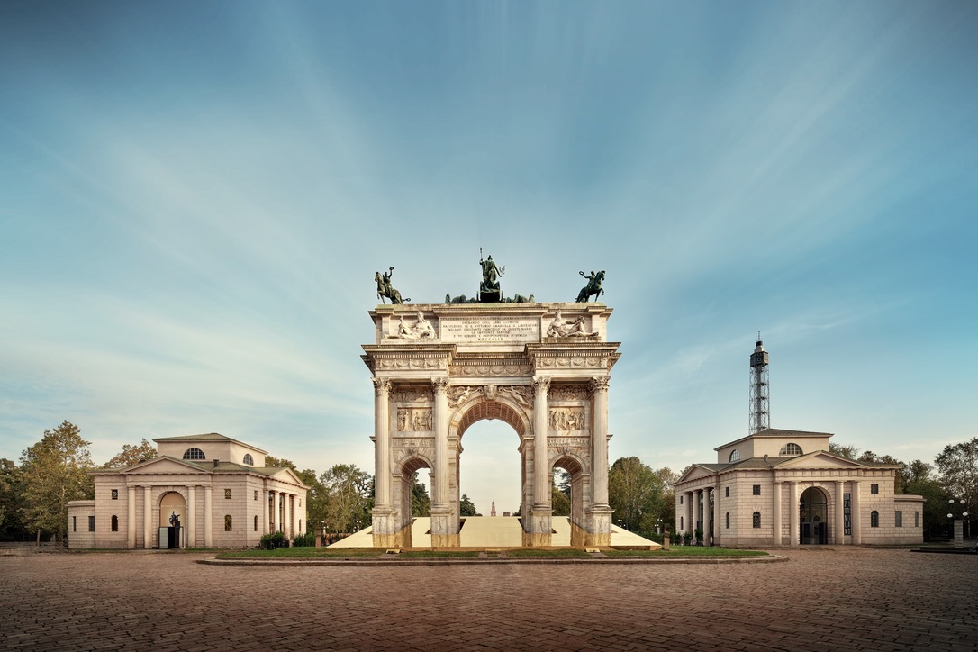 Con una superficie riflettente, l’artista affonda i basamenti delle arcate dell’Arco della Pace di Milano, restituendone alla città un’immagine riflessa e capovolta dello stesso.
