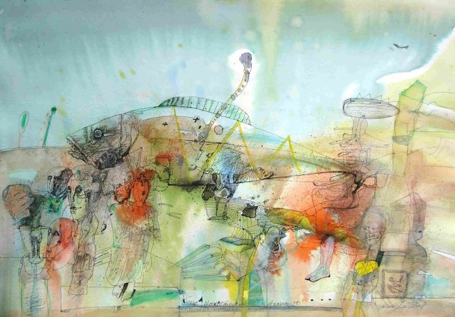 Ion Atanasiu Delamare (Bucarest, 1955) dà vita a piccoli mondi immersi in orizzonti liquidi, che richiamano la mobilità dell’acqua e le atmosfere ovattate del sogno. I suoi personaggi si muovono liberamente in una prospettiva irreale raccontando, con toni spesso ironici e surreali, storie di uomini, animali e creature chimeriche. Atanasiu Delamare illustra improbabili storie (o sogni?) dove i suoi protagonisti si affollano alla ricerca di un tracciato che, come il suo segno, lascia solo impronte vaghe, indecifrabili.