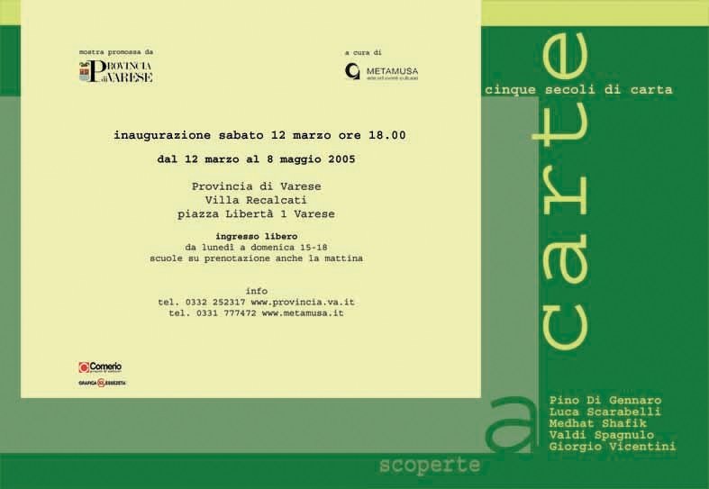 Nella suggestiva sede di Villa Recalcati a Varese, cinque importati artisti del panorama italiano sono stati invitati a confrontarsi con un materiale particolare, già da loro sperimentato, quale la carta. All’interno del progetto “Cinque Secoli di Carta” la Provincia di Varese propone la mostra A Carte Scoperte con opere di Pino Di Gennaro, Luca Scarabelli, Medhat Shafik, Valdi Spagnulo e Giorgio Vicentini a cura di METAMUSA arte ed eventi culturali.