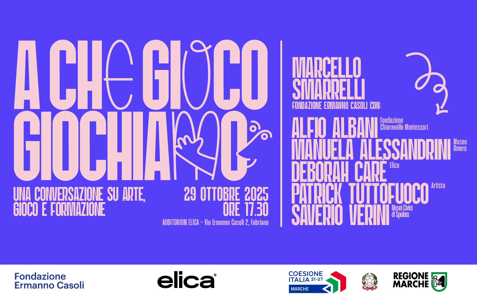 La Fondazione Ermanno Casoli presenta mercoledì 29 ottobre alle ore 17.30 presso l’Auditorium Elica a Fabriano A che gioco giochiamo, una conversazione aperta al pubblico dedicata al rapporto tra arte, gioco e formazione.