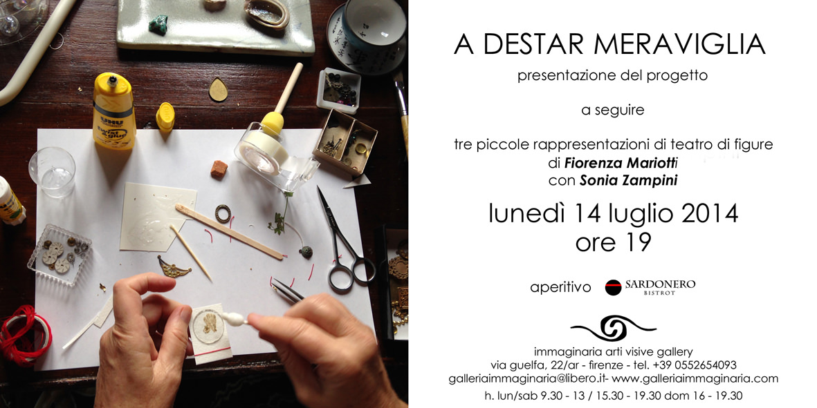 Lunedì 14 luglio alle ore 19.00, presso la sede della Galleria Immaginaria di Firenze, sarà presentato il progetto “A destar meraviglia” a cura Fiorenza Mariotti, la quale presenterà a seguire tre piccole rappresentazioni di teatro di figure, e Sonia Zampini.