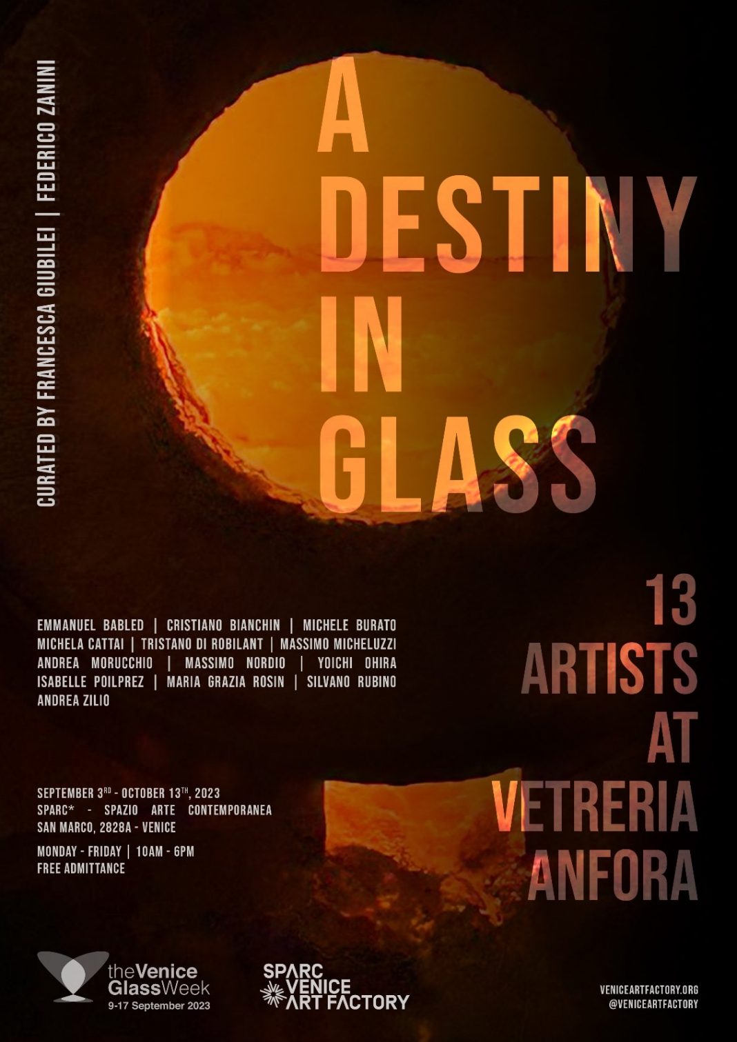 La mostra A DESTINY IN GLASS. 13 ARTISTS AT VETRERIA ANFORA, presentando le opere di tredici tra gli artisti che sin dall’inizio e con regolarità hanno frequentato questa fornace, intende metterne in luce il ruolo e l’approccio al vetro come medium artistico da parte degli artisti invitati.