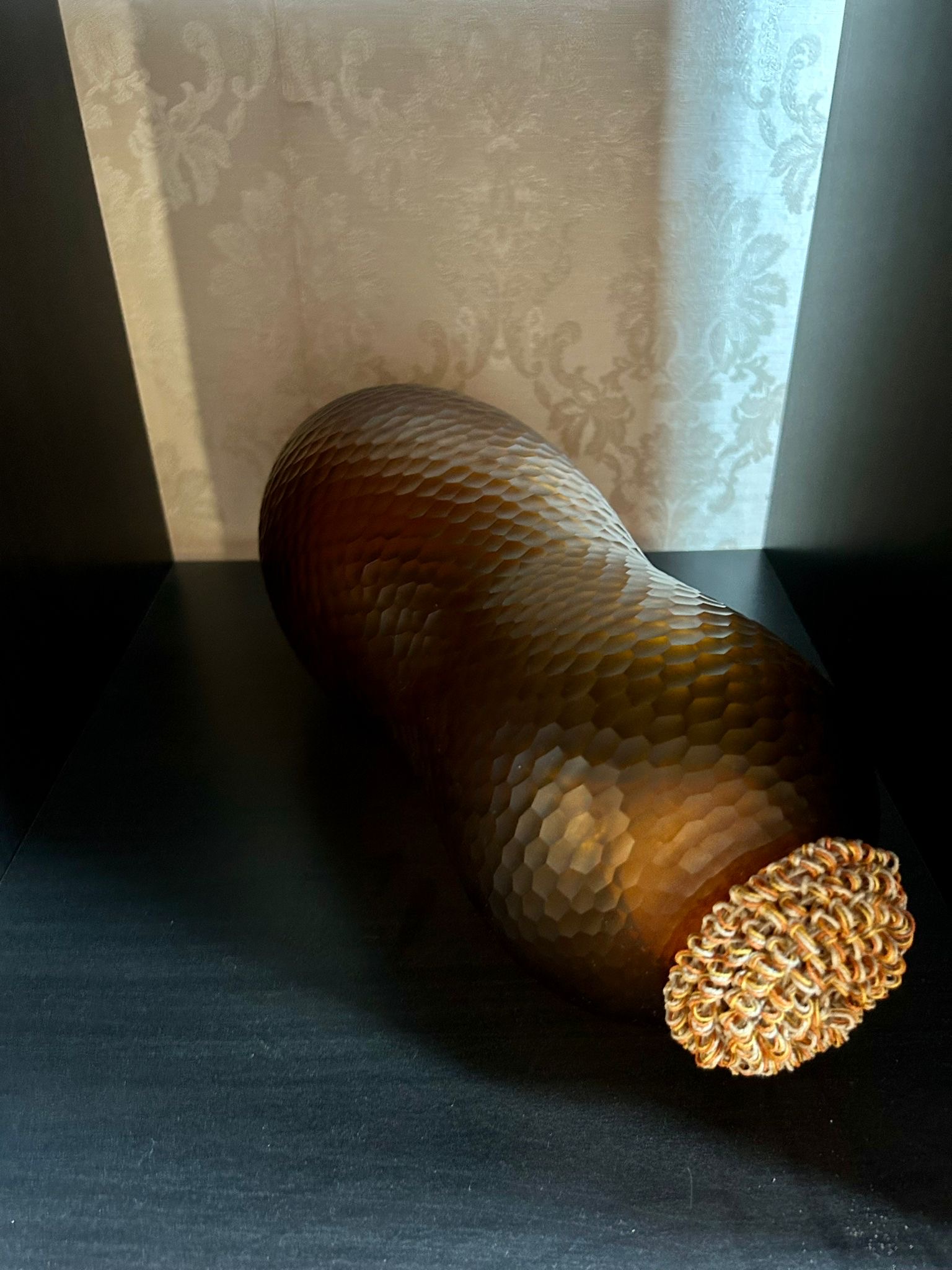 Gli anni Novanta sono stati un decennio particolarmente vivace a Venezia per quanto riguarda le ricerche espressive con il vetro. Ed è proprio in questo periodo che la storica vetreria Anfora ha iniziato un percorso completamente nuovo, muovendo dalla produzione di bicchieri, avviata nel 1976, alla produzione artistica. L’intuizione del proprietario e direttore Renzo Ferro insieme alla sensibilità e abilità dei maestri soffiatori Livio Serena (fino al 2001), Andrea Zilio e dei molatori Giacomo Barbini prima e Matteo Senigaglia dopo hanno trasformato una fornace dedicata alla produzione seriale in un luogo per la creazione artistica e la realizzazione di pezzi unici.