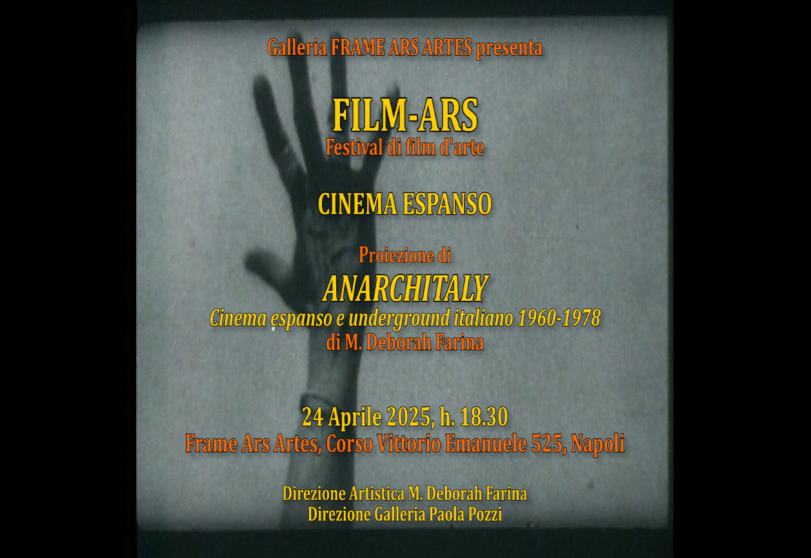 Al suo quarto appuntamento il festival-rassegna di film d’arte “Film-Ars”, porta per la prima volta a Napoli il film-documentario Anarchitaly. Cinema espanso e underground italiano 1960-1978 di M. Deborah Farina (ideatrice e direttrice artistica del festival). Presentato alla 7.Festa del Cinema di Roma e tra le più importanti testimonianze del cinema sotterraneo italiano, Anarchitaly si basa sulla retrospettiva “Orizzonti” della 68.Mostra d’Arte Cinematografica di Venezia (diretta da Marco Müller) a cura di Enrico Magrelli, Domenico Monetti, Luca Pallanch, dedicata a registi, pittori, poeti della visione trasversali, divisi tra percorso figurativo e fotografico, filmmaking, happening, performance. Realizzato con il Csc/Cineteca Nazionale, Anarchitaly rappresenta un lungo excursus, di circa venti anni di sperimentazione e anarchia, visto attraverso il cinema diretto di Deborah Farina, tra frammenti alternati, musica battente, stile graffiato e pittorico. Sotto il segno e la visione politica del cinema di Alberto Grifi, che realizza con Massimo Sarchielli Anna, l’opera centrale del movimento, Anarchitaly procede alla scoperta dei vari protagonisti del film, grazie ai curatori-traghettatori Monetti e Pallanch e al fondamentale apporto critico di Enrico Ghezzi. Si alternano e incontrano artisti come Mario Schifano, Marcello Grottesi e il Gruppo 70, Mario Carbone, Augusto Tretti, Nato Frascà, Romano Scavolini; si intrecciano alle storie i camei di Nanni Moretti, Ermanno Olmi, Tatti Sanguineti, Francesco Puma, le performance di Carmelo Bene e Maria Monti, Pilar Castel e i Fratelli Fabio e Mario Garriba, Paolo Breccia, Paolo Brunatto, Axel Rupp, in un caleidoscopio di immagini sospese tra acqua, cielo e terra, nelle alternate incursioni tra i luoghi culto della Venezia contemporanea: dalla Sala Perla del Palazzo del Cinema, ai locali della Biennale, dai corridoi dell’Excelsior alle terrazze ein plen air del Lido, sotto l’egida del Leone di San Marco e l’illuminata direzione artistica di Marco Müller. In apertura dell’evento avverrà un ‘gesto’, un flash mob d’arte, in omaggio ai Gesti dell’epoca e, a seguire, l’incontro con la regista. Per l’occasione saranno esposti alcuni quadri della stessa autrice, dalla serie “Fotogrammi”, dedicati ad Anarchitaly. Film-Ars, Festival di film d’arte, giovedì 24 aprile 2025, h. 18.30, Galleria Frame Ars Artes, Corso Vittorio Emanuele 525, Napoli. Direzione Artistica Deborah Farina; Direzione Galleria Paola Pozzi.