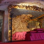 La camera da letto vede all’opera ancora Domenico Parodi per gli affreschi, mentre la straordinaria alcova nasce probabilmente su progetto di Gregorio De Ferrari, con la spettacolare decorazione che finge in stucco un grande drappo fiorito, il rivestimento di specchi sulle pareti e un parquet in eccezionale stato di conservazione.