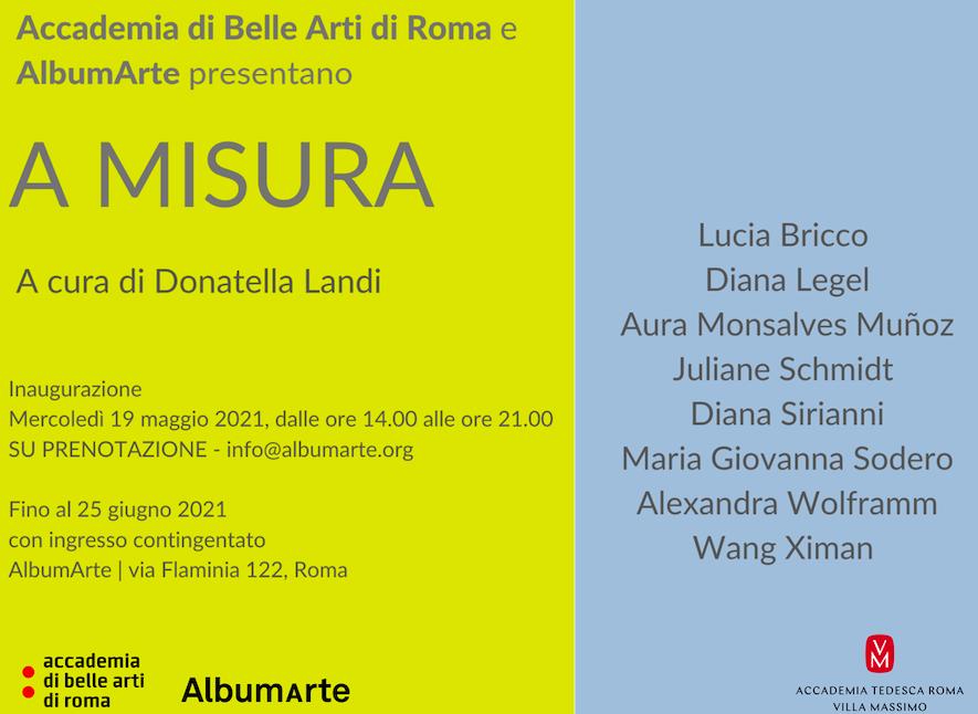 Mercoledì 19 maggio 2021 inaugura ad AlbumArte, spazio indipendente per l’arte contemporanea, la mostra collettiva delle artiste internazionali Lucia Bricco, Diana Legel, Aura Monsalves, Juliane Schmidt, Diana Sirianni, Maria Giovanna Sodero, Alessandra Wolframm, Wang Ximan dal titolo A MISURA a cura di Donatella Landi che sarà aperta al pubblico, secondo le regole sanitarie, fino al 25 giugno 2021. La mostra è stata realizzata con il sostegno dell’Accademia di Belle Arti di Roma.