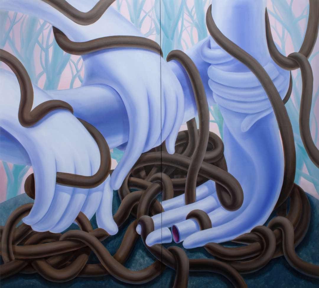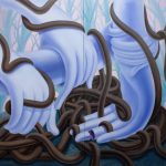 Huang Zhe è un osservatore meticoloso, ma con un senso di distanza. Le sue immagini sono piene di potere di rompere le convenzioni. Contemplazione, specchi, schizzi... In queste opere, varie linee che fluiscono liberamente, di forme diverse, sono ovunque, delineando i contorni liberamente e senza restrizioni. Colori intensi e strati sottili a toni fre