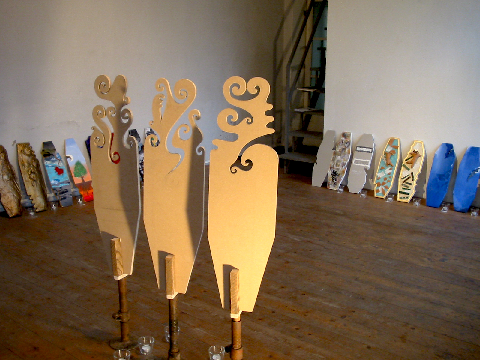 Sono esposte 16+3 opere eseguite a quattro mani tra Mavi Ferrando e 16 artisti in uno scambio di linguaggi e poetiche. Su una serie di piccole sculture in legno dalla forma ottagonale gli artisti sono stati invitati ad intervenire con un’operazione di contaminazione linguistica sul tema Ex voto.