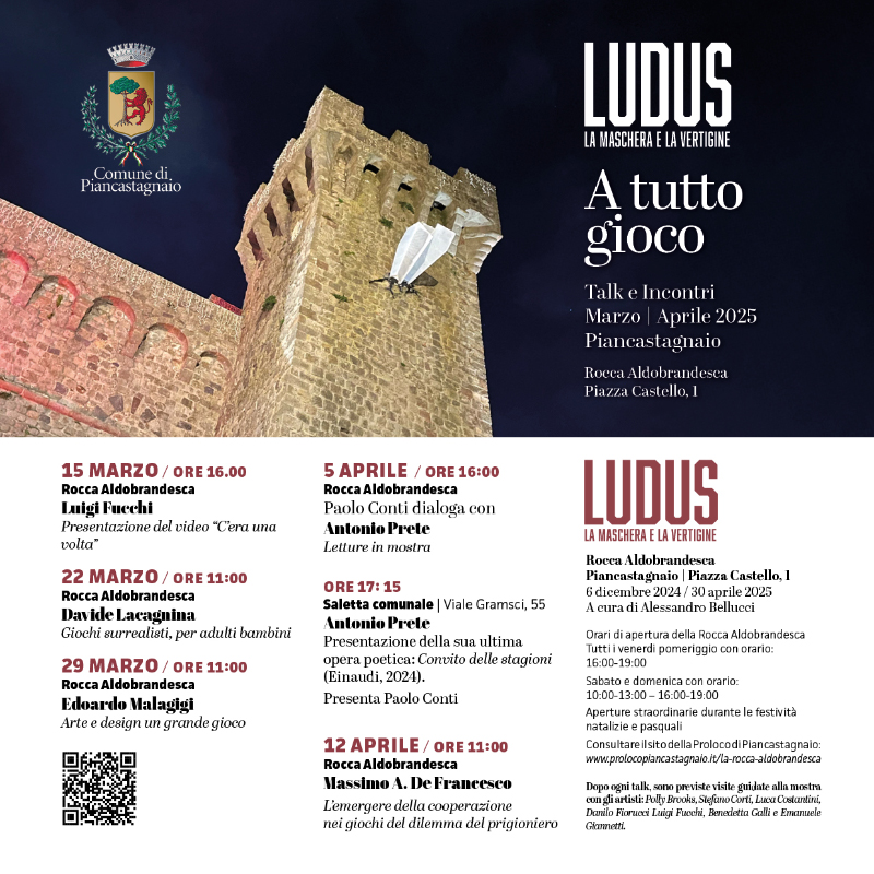 Nell’ambito della mostra “Ludus. La maschera e la vertigine”, in corso alla Rocca Aldobrandesca di Piancastagnaio dal 6 dicembre 2024 al 30 aprile 2025 e curata da Alessandro Bellucci, si terrà una serie di incontri tra marzo e aprile 2025. L’iniziativa, dal titolo “A tutto gioco / Talk e Incontri”, rappresenta un momento di approfondimento e dialogo interdisciplinare sul tema del gioco, esplorato nelle sue molteplici sfaccettature: artistiche, letterarie, economiche e sociali.