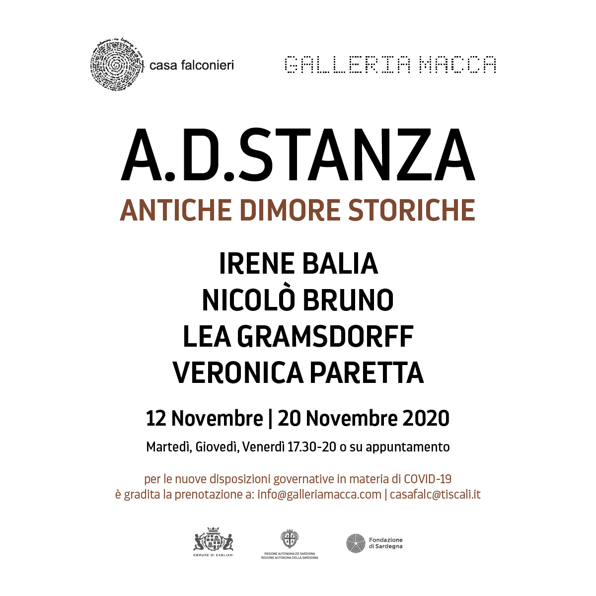 Galleria Macca è lieta di presentare A.D.STANZA, una mostra che si inserisce nell’ambito della collaborazione con Casa Falconieri al progetto “Antiche Dimore Storiche”. La mostra si articola in quattro appuntamenti in cui diversi gruppi di Artisti presentano lavori inediti prodotti nel 2020 durante il lockdown. Ad aprire il dialogo, il 29 Ottobre, Gabriella Locci (vive e lavora a Cagliari), Crisa (Cagliari, 1984) e Alberto Marci (Cagliari, 1985); il 12 Novembre è la volta di Veronica Paretta (Cagliari, 1986), Lea Gramsdorff (vive e lavora a Cagliari), Nicolò Bruno (Milano, 1989) e Irene Balia (Iglesias, 1985, vive e lavora a Milano); seguono Marco Ceraglia (vive e lavora a Sassari), Pietro Desirò (Poggibonsi, 1994) e Giovanna Secchi (vive e lavora a Sassari) dal 24 Novembre; infine Giulia Casula (Cagliari, 1977), Simone Dulcis (Milano, 1974, vive e lavora a Cagliari) e Irene Podgornik Badia (vive e lavora a Torino) dal 3 Dicembre.
