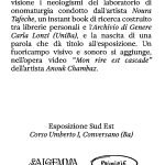 Nello spazio di Esposizione Sud Est, partner culturale del progetto, saranno presentati: i neologismi nati dal laboratorio sperimentale di onomaturgia condotto da Noura Tafeche; un instant book di ricerca, costruito a partire dalle ricerche personali delle curatrici e dalla collaborazione con l’Archivio di Genere Carla Lonzi dell’Università Aldo Moro di Bari; infine in visione l’opera “Mon rire est cascade” dell’artista Anouk Chambaz.