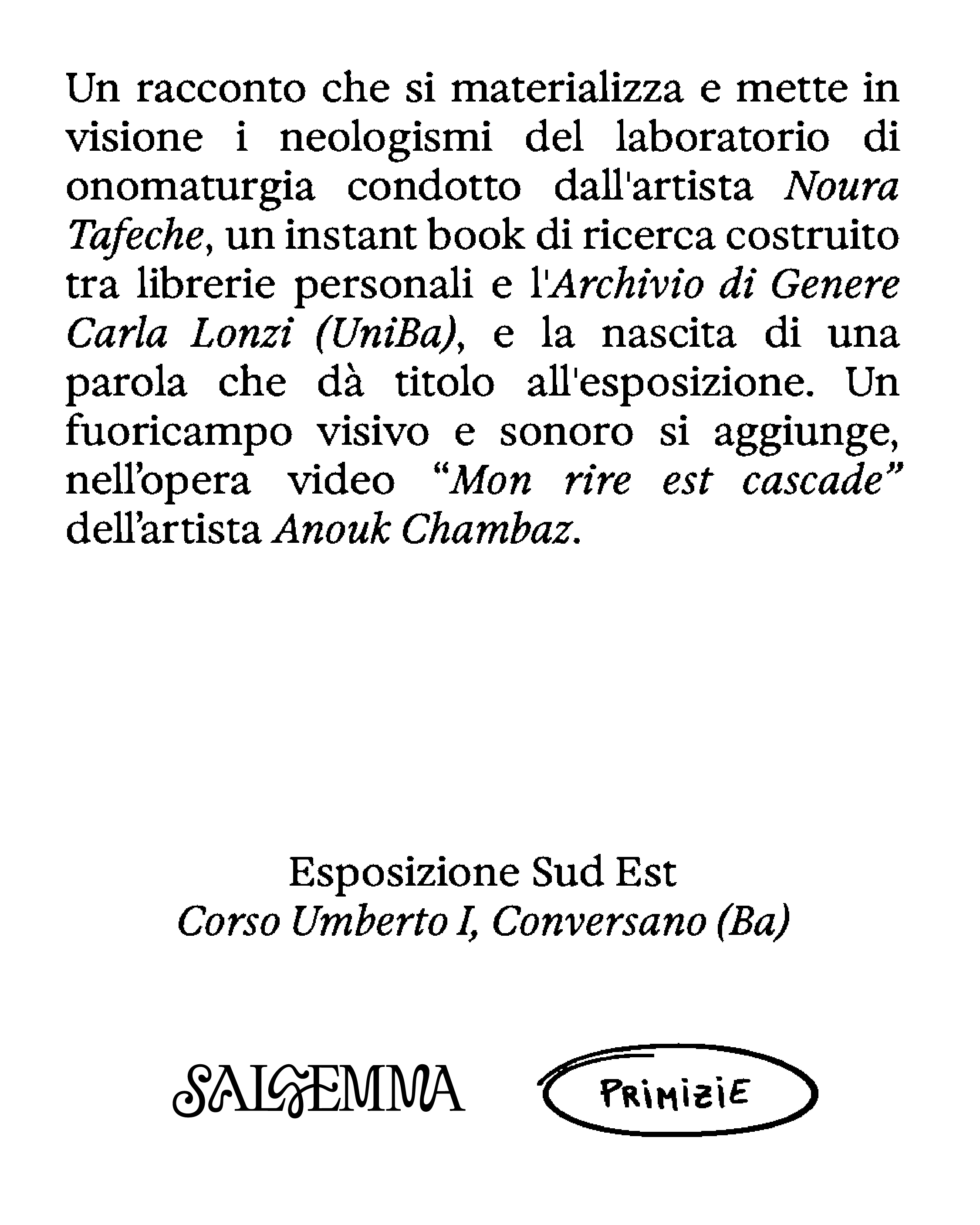 Nello spazio di Esposizione Sud Est, partner culturale del progetto, saranno presentati: i neologismi nati dal laboratorio sperimentale di onomaturgia condotto da Noura Tafeche; un instant book di ricerca, costruito a partire dalle ricerche personali delle curatrici e dalla collaborazione con l’Archivio di Genere Carla Lonzi dell’Università Aldo Moro di Bari; infine in visione l’opera “Mon rire est cascade” dell’artista Anouk Chambaz.