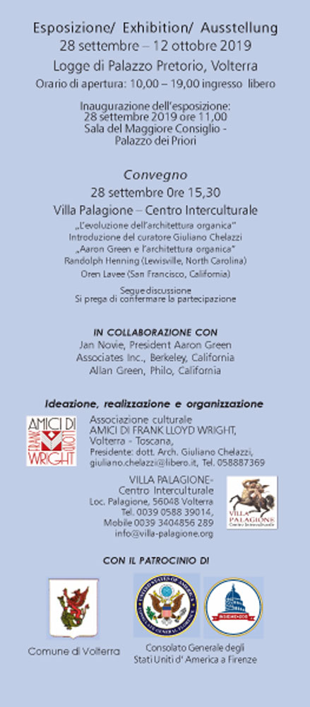 Esposizione di foto, progetti, videoproiezione di interviste ad architetti fellow di F.L.Wright/Aaron Green. Interviste fatte nel 2019 in California. Catalogo disponibile