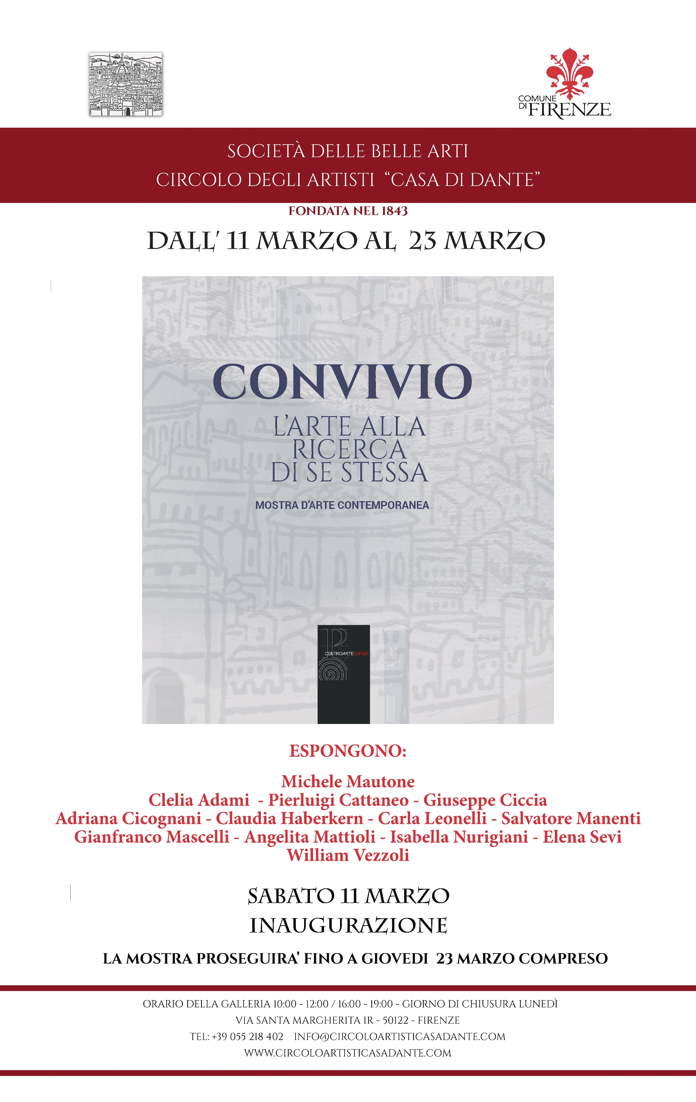 A Firenze, presso la Società delle Belle Arti – Circolo degli artisti – Casa di Dante, si inaugura sabato 11 marzo 2023 la Mostra Convivio curata da Pierluigi Cattaneo e da Gianfranco Mascelli, presentata dal Prof. Mauro Corradini storico dell’arte e organizzata dal Centro Arte Lupier. Ospiterà l’incontro di artisti provenienti da diverse regioni d’Italia le cui opere, con differenti linguaggi, materiali e tecniche espressive, esprimono le diverse personali visioni e sensibilità artistiche e umane. Un vero e proprio convivio d’arte, in omaggio al luogo che lo ospita: la Casa di Dante.