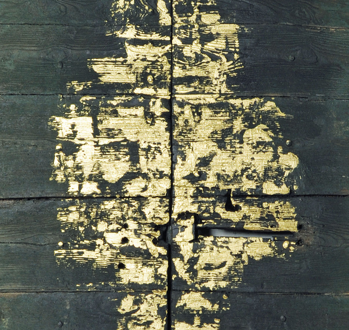 Maria Cristina Carlini partecipa a “ORO&BLU” con “La luce dopo il buio” un grande portone, addossato alla parete, squarciato al centro da un’esplosione d’oro. L’imponente opera inedita del 2022 è realizzata in legno di recupero e oro, l’artista, diversamente da altri lavori sullo stesso tema creati in passato, propone una soglia chiusa, che non lascia scampo all’osservatore e impedisce all’occhio di oltrepassarla, il legno di recupero del portone racchiude in se il fascino di un passato ignoto, una memoria comune e condivisa che trasforma in straordinario l’ordinarietà del quotidiano. Il potente intervento dato dall’oro rende prezioso e luminoso il legno antico e ciò che custodisce, una composizione materica e concreta che suscita ricordi e memorie personali quanto ancestrali. Con quest’opera Carlini continua la sua ricerca verso le origini e il passato comune e ci sfida ad oltrepassare quella soglia verso un linguaggio universale come quello dell’arte.