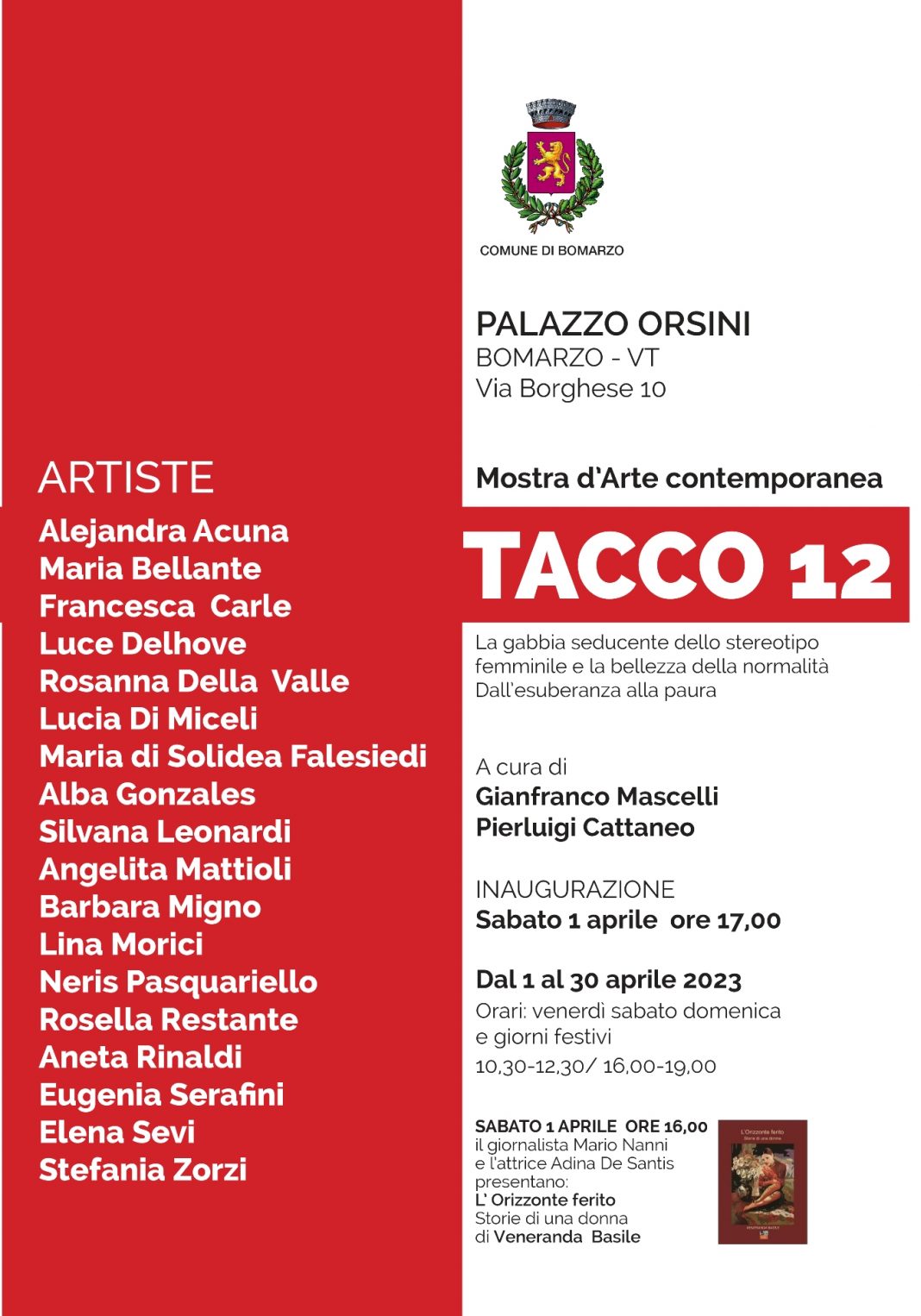 Sabato 1° aprile 2023 s’inaugura a Palazzo Orsini di Bomarzo in provincia di Viterbo la mostra d’Arte contemporanea “Tacco 12 – La gabbia seducente di uno stereotipo femminile”, che proseguirà per tutto il mese di Aprile 2023. E’ una mostra tutta al femminile cui partecipano 18 rinomate artiste.