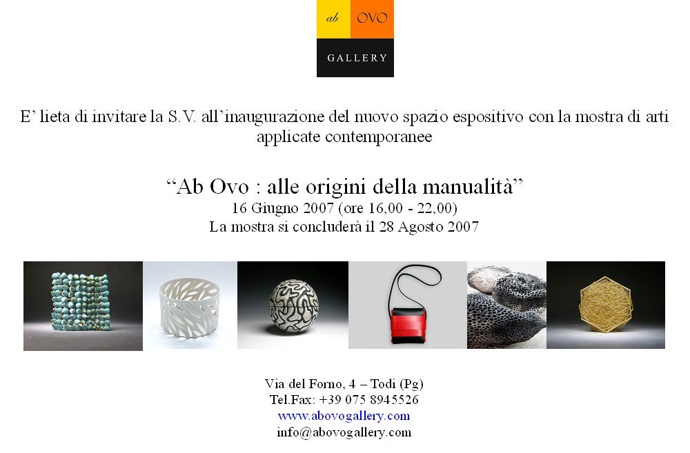 Si comunica che sabato 16 Giugno 2007, in Umbria, nel centro storico di Todi (Pg), sarà inaugurata la Ab Ovo Gallery, un nuovo spazio espositivo esclusivamente dedicato alle arti applicate contemporanee europee.