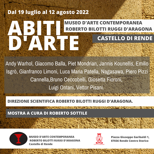 la collezione ABITI D'ARTE presso il Museo d'arte contemporanea Roberto Bilotti Ruggi d'Aragona si arricchisce di nuove donazioni. Per l'occasione con la direzione scientifica di Roberto Bilotti e la curatela di Roberto Sottile, tutti gli abiti ritornano in mostra, con un nuovo allestimento, che resterà aperto al pubblico fino al 12 agosto 2022. Ingresso Gratuito.