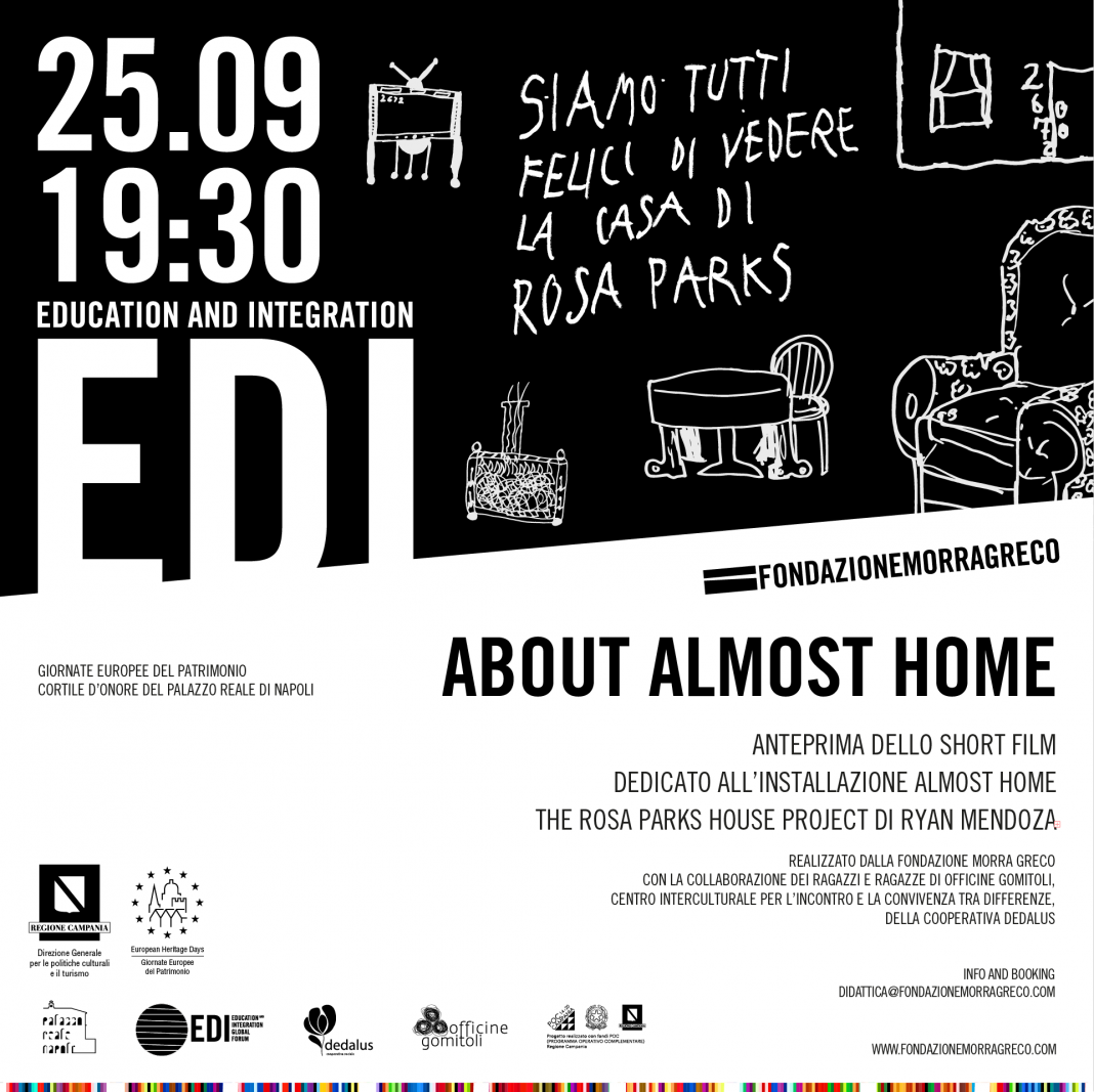 Nell’ambito delle Giornate Europee del Patrimonio (GEP) 2021, la Fondazione Morra Greco vi invita per un appuntamento speciale negli spazi del Cortile d’Onore di Palazzo Reale, sede dell’installazione Almost Home – The Rosa Parks House Project di Ryan Mendoza. Per l’occasione alle 19.30 sarà proiettato lo short film About Almost Home, ispirato alla storia di Rosa Parks, nato dalla collaborazione con un gruppo di ragazzi e ragazze stranieri di Officine Gomitoli, il Centro Interculturale per l’incontro e la convivenza tra differenze della Cooperativa Dedalus. Alla proiezione seguiranno visite guidate interattive all’installazione.
