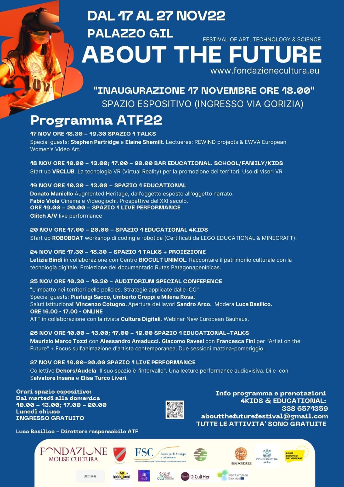 Torna in Molise About The Future, dal 17 al 27 novembre 2022 al Palazzo GIL di Campobasso, il festival che indaga il rapporto cross-culturale, la diffusione dei nuovi linguaggi artistici e le convergenze tecnologico-scientifiche derivate dalla cultura contemporanea. Il programma oltre alla sezione espositiva, prevede una serie di appuntamenti ed incontri dal profilo internazionale e specialistico nel contesto del management culturale e le policies di riferimento. Prodotto ed organizzato dalla Fondazione Molise Cultura con la direzione di Luca Basilico:“il Festival è un laboratorio sperimentale e piattaforma di ricerca e studio di pratiche artistiche contemporanee. - afferma Basilico. La rilettura del passato è il solco entro cui si inseriscono le visioni e le tendenze del XXI secolo. Con ATF raccontiamo in Molise le innovazioni internazionali delle ICC, senza tralasciare il tessuto produttivo regionale. L'attività consente di posizionare la Fondazione Molise Cultura all'interno di un mercato globale di Festival che operano all'interno della trasversalità settoriale e le contaminazioni, inoltre è ponte relazionale. Il Palazzo GIL della Regione Molise diventa luogo di produzione sofisticato con una ferma attenzione sia all'audience che agli standards”. Il progetto mira a diventare un punto di riferimento nazionale ed europeo per gli operatori del settore, una strategia di sviluppo nell'area del mezzogiorno, nonché appuntamento annuale di confronto e scambio di buone pratiche".