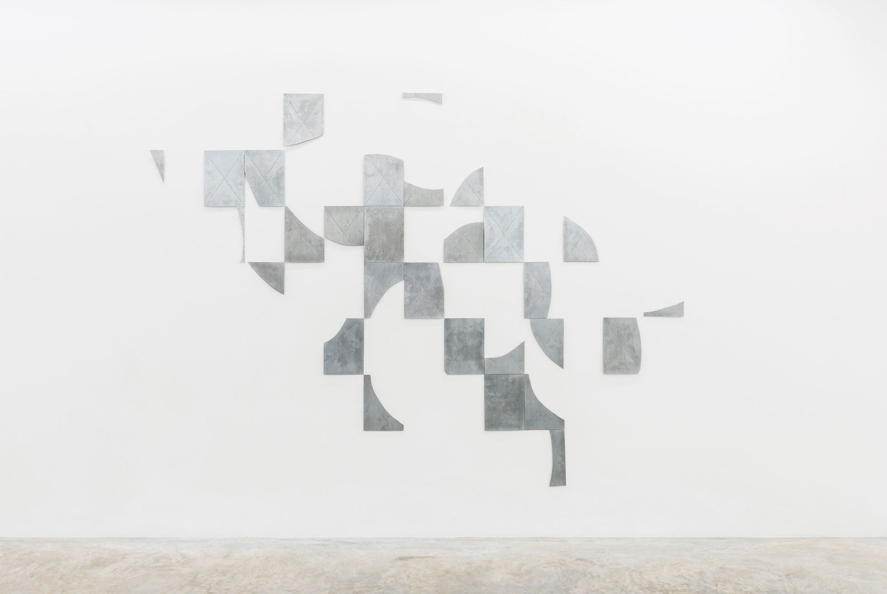 instance, the cuts and repeated cross-shaped motifs of the metals in Timeline suggest the evolution in space and time of the work. This revelation is not necessarily recognisable at first glance, nor is it essential for reading Krause’s production; rather, it resonates as a conjecture about the spatial and temporal development of the work.