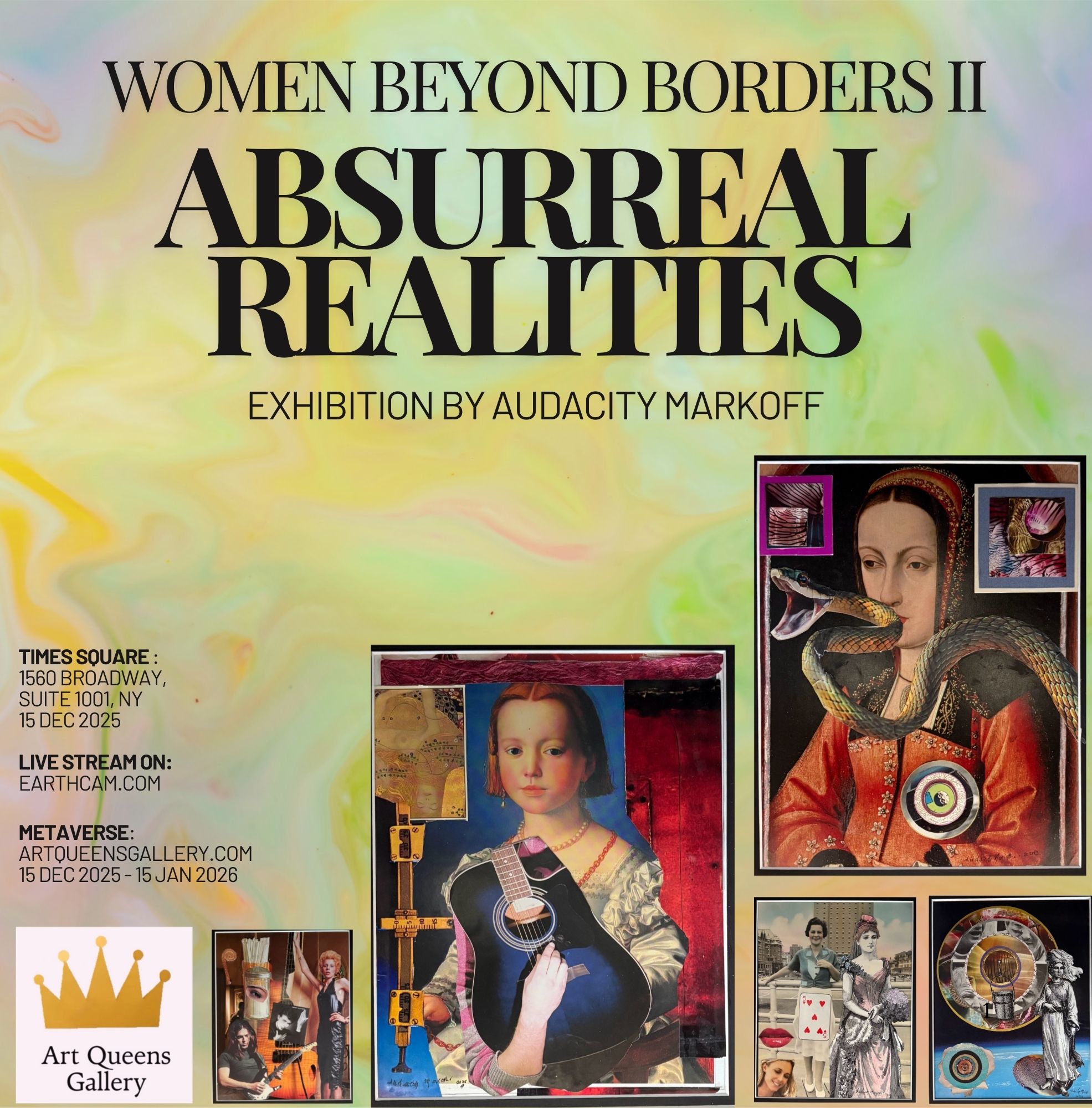 Absurreal Realities: Audacity Markoff’s Collage Worlds Take Over Times Square. Presented by Art Queens Gallery as part of Women Beyond Borders II in Times Square, Absurreal Realities introduces Markoff’s distinctive collage practice to an international public stage.