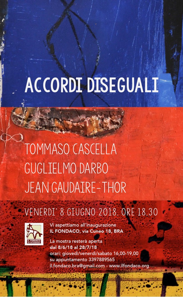 Venerdì 8 giugno, alle 18.30 alla galleria “Il Fondaco” di via Cuneo, 18, inaugura la mostra “Accordi diseguali”. Tre artisti insieme per l’arte, con l’arte: Tommaso Cascella romano, Guglielmo Darbo ferrarese e Jean Gaudaire-Thor francese. Tre artisti 50 opere, in cui primeggia l’uso della materia come mezzo di comunicazione, attraverso tecniche diverse che vanno dalla pittura, dall’assemblaggio, all’incisione, tutto quanto per narrare, esprimere la propria particolare visione esistenziale. La mostra sarà visitabile ad ingresso gratuito fino al 28 luglio 2018, il giovedì, venerdì e sabato dalle 16 alle 19.