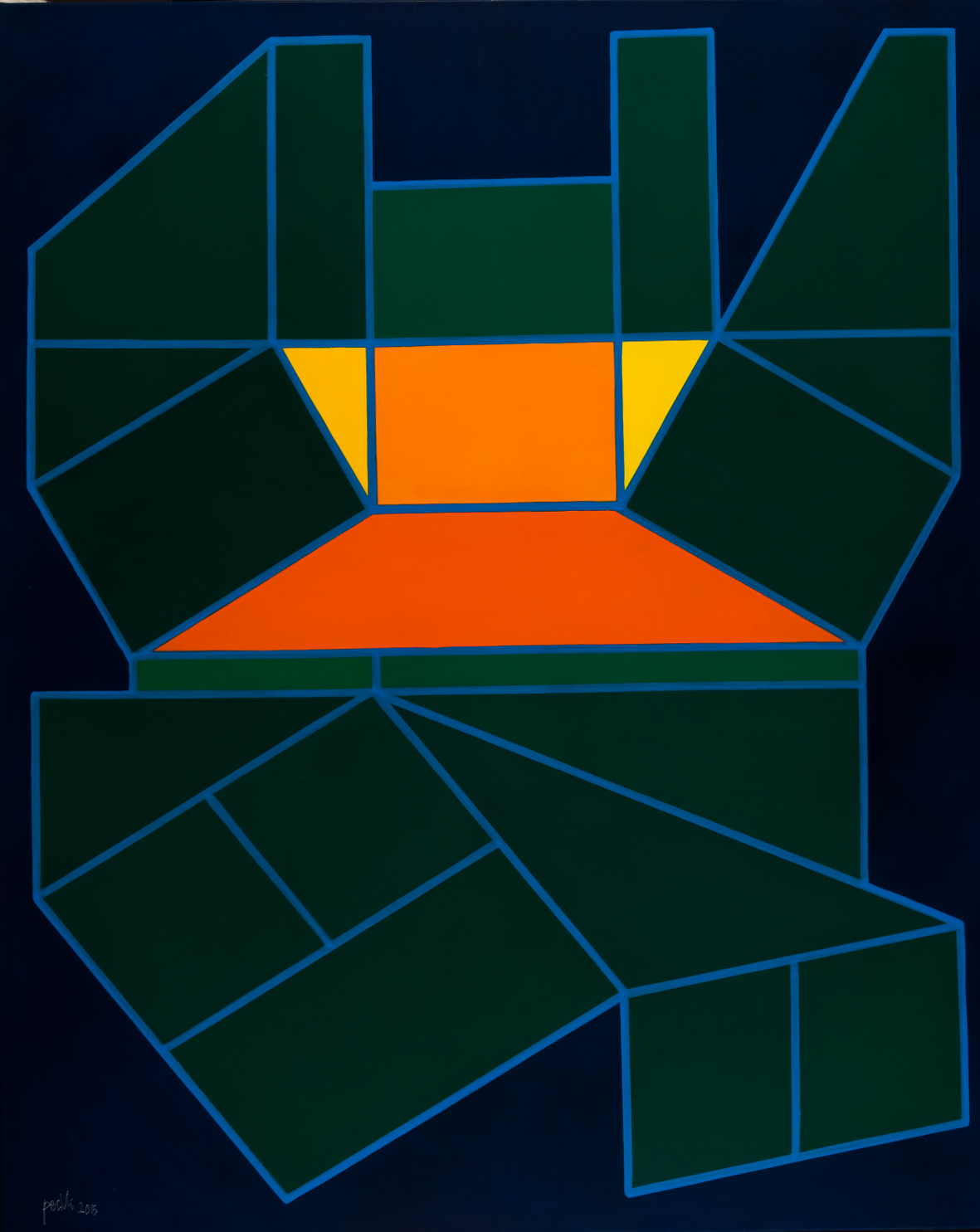 A Orvieto, negli spazi di Vetrya, la Fondazione Luca e Katia Tomassini fa da contrappunto presentando una serie di 26 piccole e coloratissime composizioni insieme a una rigorosa sequenza di 13 dipinti di medie e grandi dimensioni a fondo nero realizzati tra il 2008 e il 2015, in cui le articolazioni cromatiche e strutturali delle forme si accentuano vivacissime in contrasto con l'oscurità che le avvolge, ponendole sfrontatamente alla ribalta senza nessuna modulazione o ripensamento e sembrano dilatarsi fino a emergere nello spazio fisico, come una dichiarazione decisa ed estrema. Si tratta di immaginifiche e proliferanti strutture eseguite sulle tonalità degli azzurri e dei verdi, con improvvise accensioni del giallo o del rosso che descrivono spazi virtuali analoghi a certe configurazioni digitali tridimensionali. Qui, più che altrove, l'artista sembra guardare al futuro (“In viaggio verso il futuro”, 2009), in sintonia con la nuova dimensione ubiquitaria offerta da internet e dai social-network, attraverso formulazioni geometriche che conquistano spazi inesplorati, frutto del nostro inconscio e della nostra percezione.