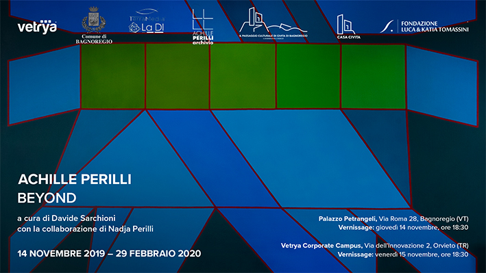 La mostra “Achille Perilli. Beyond”, che raggruppa complessivamente una selezione di 68 lavori, sarà aperta al pubblico dal 14 novembre 2019 al 29 febbraio 2020 presso Palazzo Petrangeli di Bagnoregio (VT) e da venerdì 15 novembre al 29 febbraio 2020 presso la Fondazione Luca e Katia Tomassini, negli spazi del Vetrya Corporate Campus di Orvieto (TR).