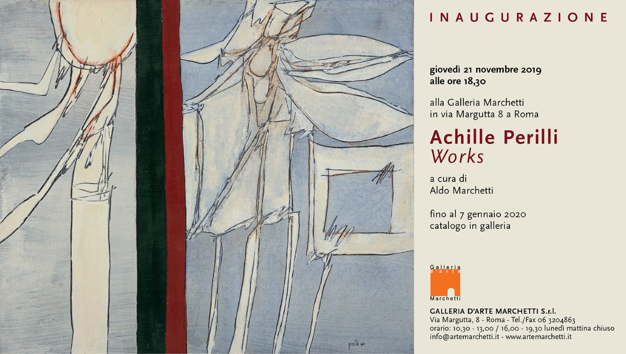 Giovedì 21 novembre alle ore 18.30 presso la Galleria d'arte Marchetti di Roma, sita in Via Margutta 8, sarà inaugurata la mostra Achille Perilli, Works. Opere dal 1958 al 2008 a cura di Aldo Marchetti. L'esposizione presenterà al pubblico una selezione di opere del Maestro Perilli. Oltre alle opere su tela, sarà esposta l'importante scultura in legno di olmo, Il Laocoonte, datata Anno 2000 e una splendida tempera su carta del 1961, Senza titolo.