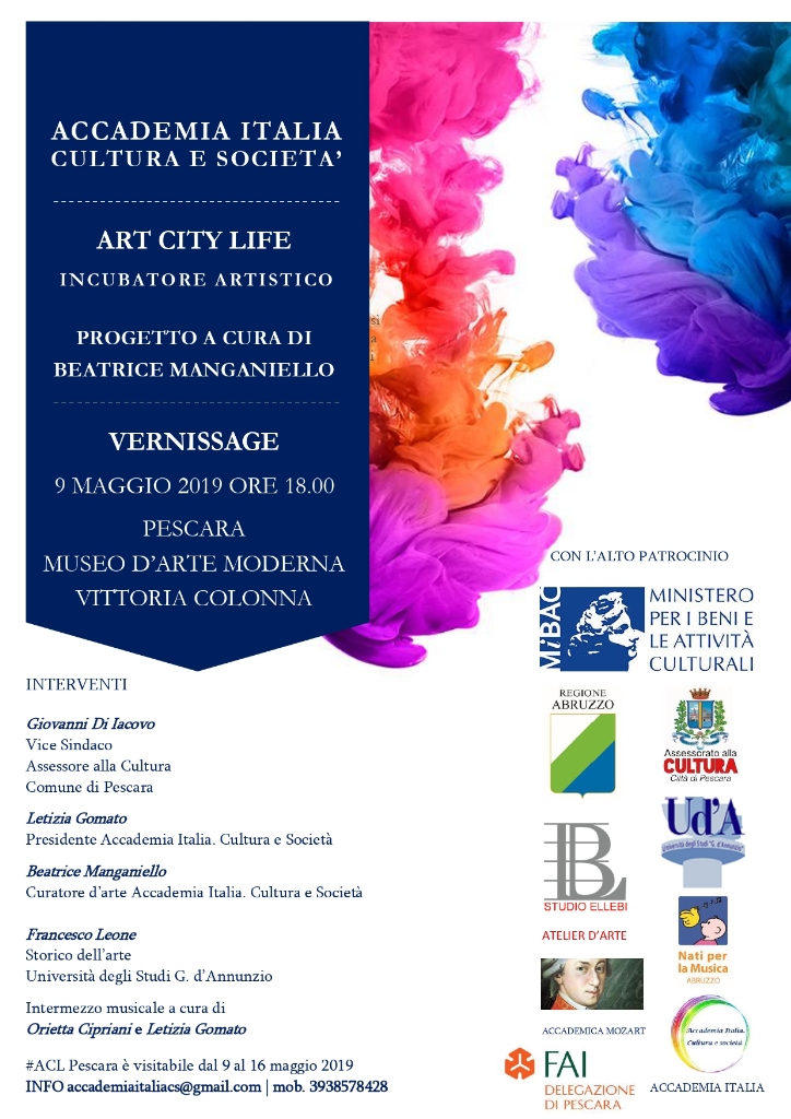 ll progetto #ACL – Art City Life Pescara – nasce da un’idea di Accademia Italia. Cultura e Società, ente di ricerca artistica e formazione in ambito culturale e musicale, ed è curato da Beatrice Manganiello. #ACL è un incubatore di artisti nato per agevolare il confronto e divulgare opere e idee che si fondono in un percorso di continua crescita, attraverso esposizioni e residenze artistiche volte a perfezionare e valorizzare le esperienze individuali e renderle fruibili nei tessuti urbani. Art City Life ha come obiettivo quello di creare una rete di servizi e relazioni utili a favorire e promuovere la cultura visiva dell’arte.