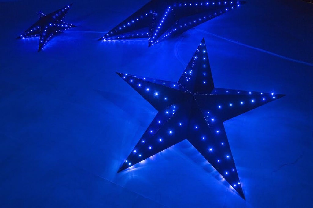 grande installazioni con tre stelle luminose, insieme tridimensionali e immateriali nella loro