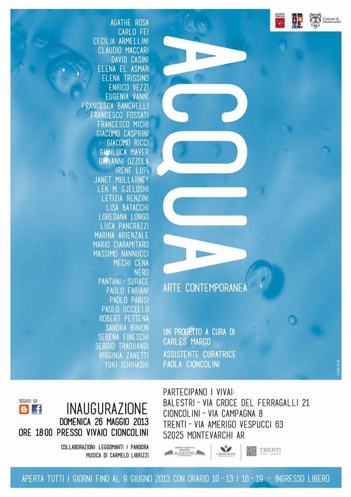 L’associazione Montevarchi Arte, con il supporto del Comune di Montevarchi e il patrocinio della Regione Toscana, è lieta di presentare la mostra “Acqua”, curata da Carles Marco, presso i vivai storici: Balestri, Trenti e Cioncolini di Montevarchi.