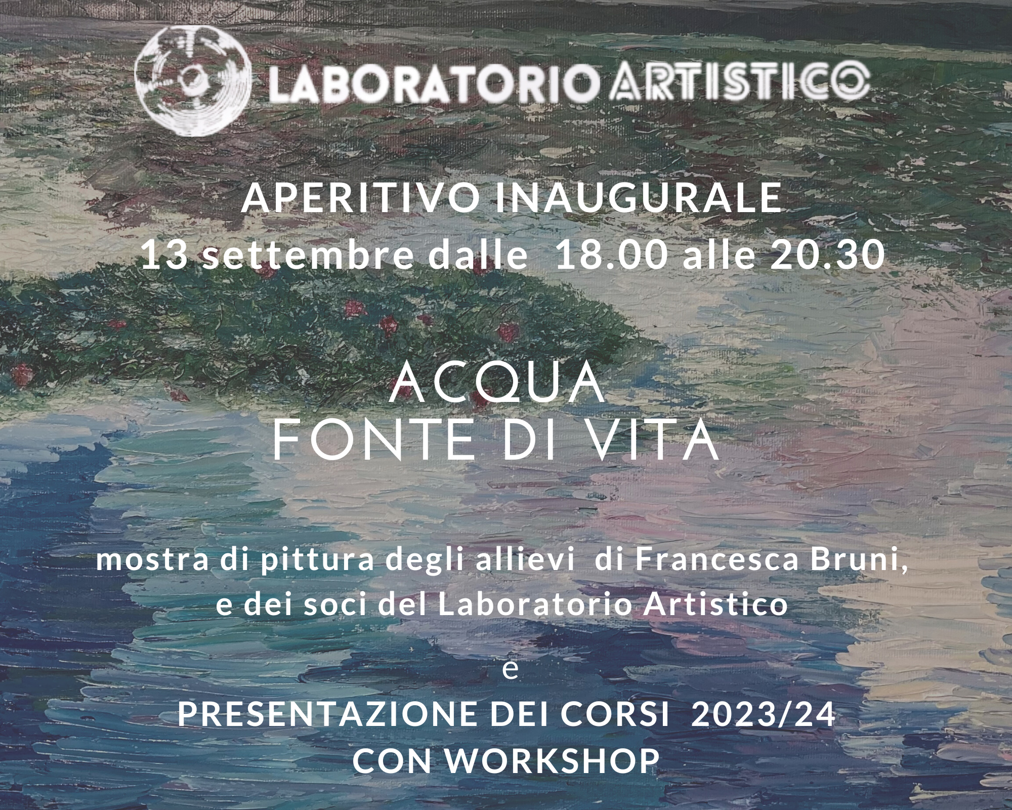Mostra di pittura degli allievi della pittrice Francesca Bruni e dei soci del Laboratorio Artistico, dal tema ACQUA, FONTE DI VITA per chiamare ad una presa di coscienza di questa risorsa preziosa. Con aperitivo inaugurale e presentazione dei corsi di workshop 2023/2024